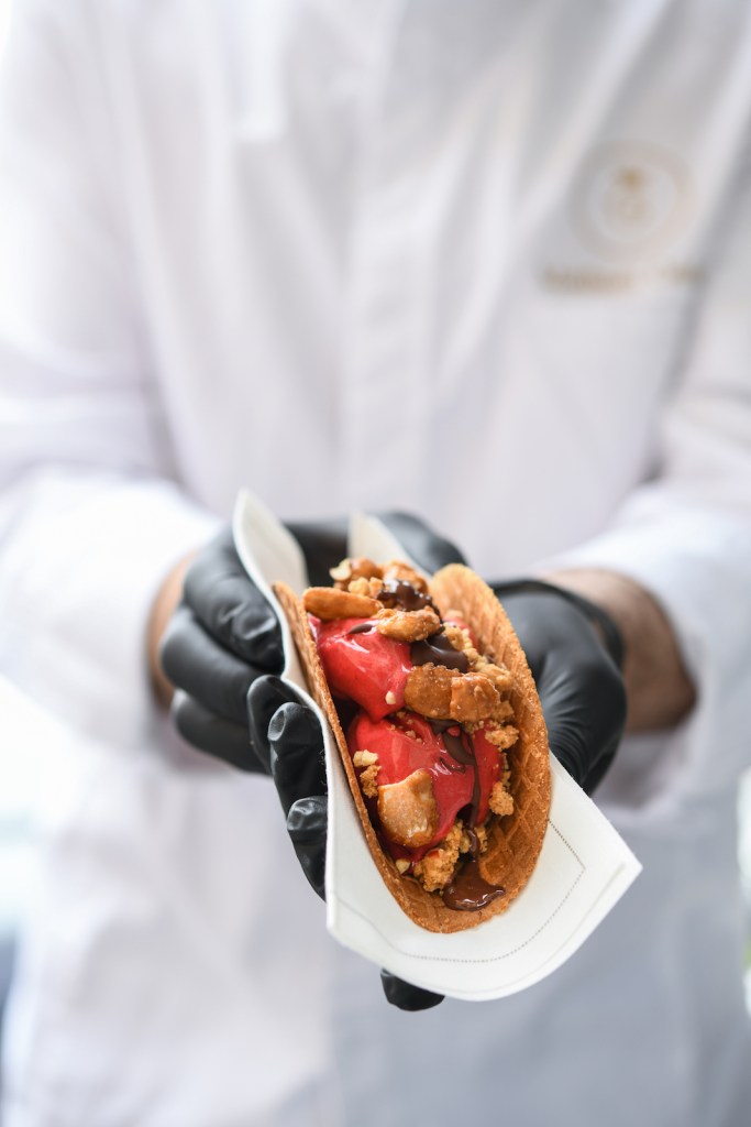 It all starts out with an icy wafer cone which is then topped off with one of eight ice-creams: vanilla, chocolate, hazed-nut praline, salty caramel, apricot, lemon, raspberry and an ephemeral flavor that changes each week. And in good old-fashioned ice-cream sundae-like fashion the ice-cream wafers are topped off with gourmet toppings like almonds, hazelnuts and pistachios. Each week you can discover a new flavor ranging from mango to banana, passion fruit or Granny Smith apple. Everything is made in-house inside of the luxury hotel that is the Crillon.