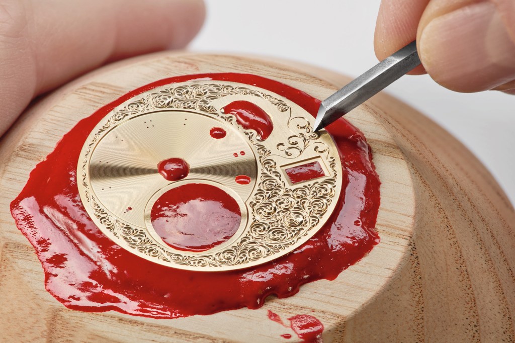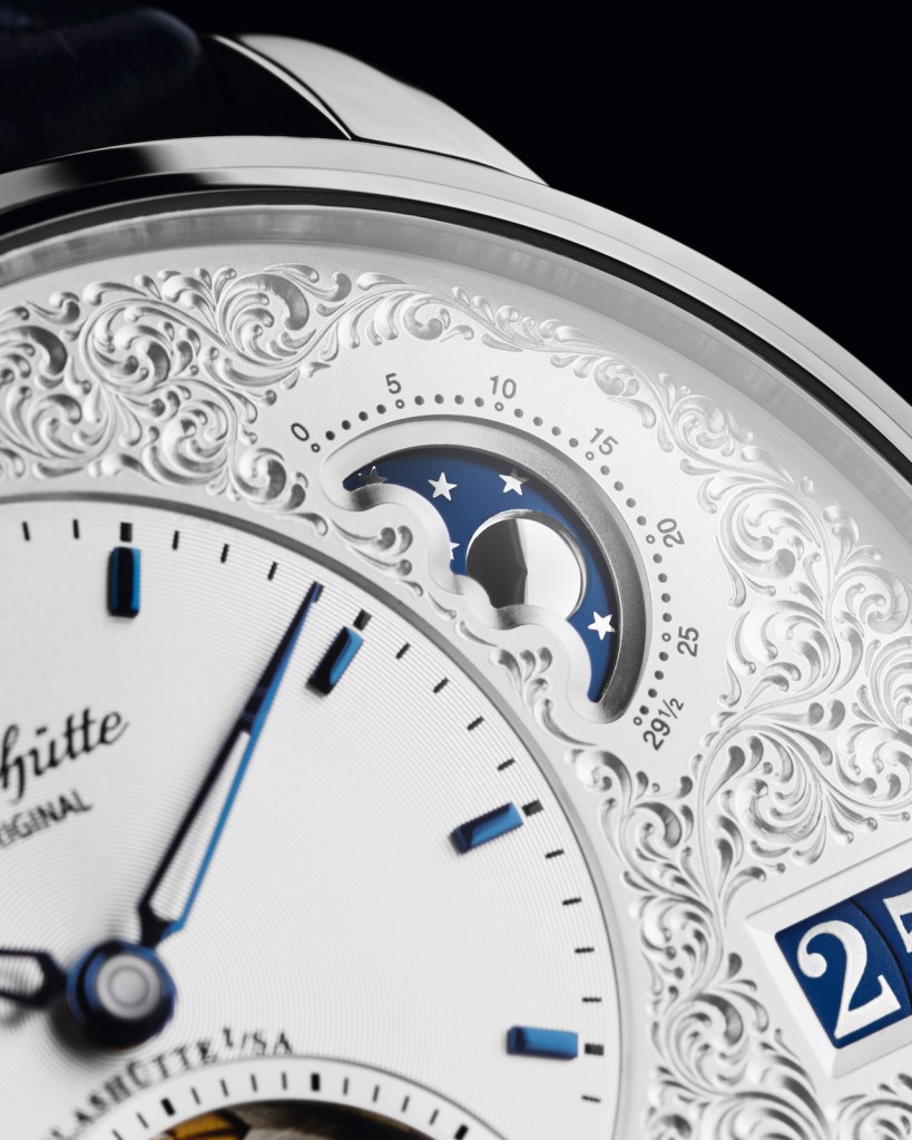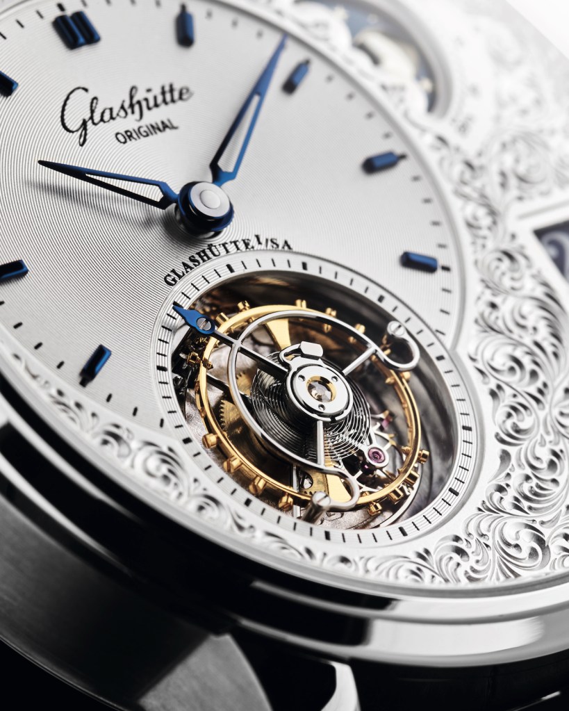 All of the engravings on this masterpiece were undertaken by craftsmen in the dial manufacture of Glashütte Original in Pforzheim, Germany. The house of Glashütte Original was founded in 1845 and is established in the small city of Glashütte in Saxony. The house manufactures 95% of its components, movements and filigree dials in-house.