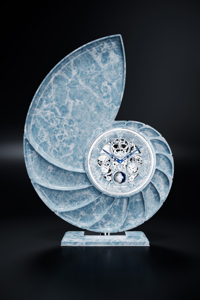 Interior design and astronomical timekeeping join forces in an astonishing piece of time and design. The houses of Thomas Mercer and Winch Design have just brought out an incredible work of stone masonry and timekeeping with the Nautilus Stone, a unique sculpted timepiece drawing its inspiration from the ocean and the beautiful multi-chambered nautilus shell. The design teams garnered their inspiration from the spiral of the nautilus shell and drew an elegant shape that follows the curvature of the stone and spirals out from the intricate clock face within.