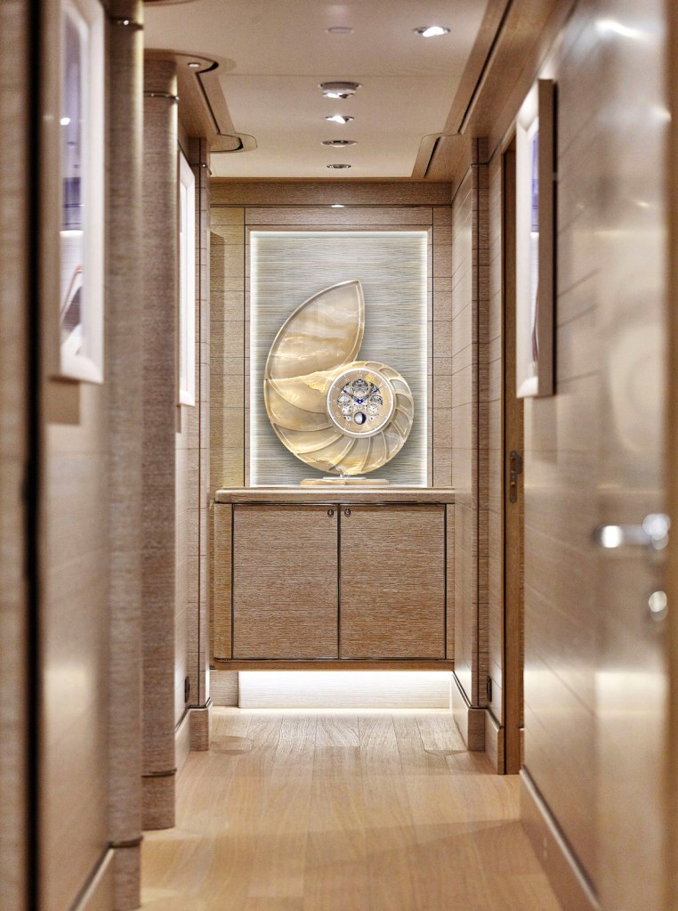 The Nautilus Stone is the work of one of the world’s master stone cutters Marmor Hotavlje of Slovenia and is available in sodalite, golden onyx and azul cielo marble and crafted by the hands of highly skilled master stone masons. It is a perfect piece to be showcased on a yacht.