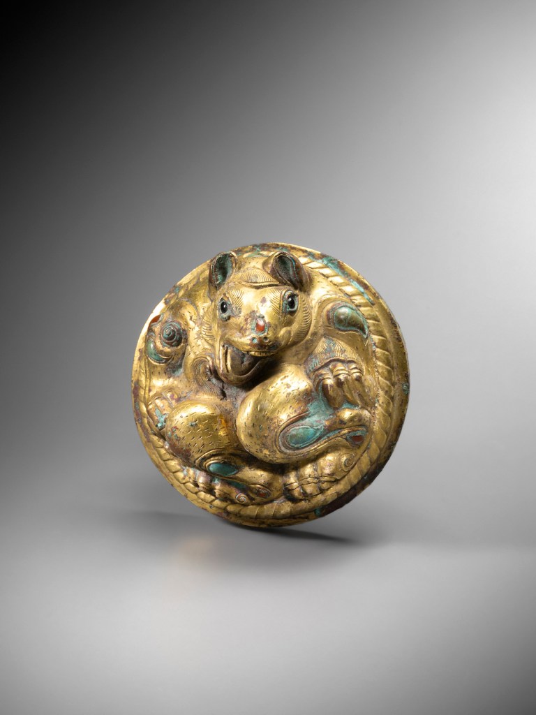 One of the mat weights in the form of a frolicking bear. Gilt bronze inlaid with agate and turquoise, Western Han dynasty, 2nd – 1st centuries B.C. Photo ©Courtesy Galerie Christian Deydier. Handout via The Gourmet Gazette