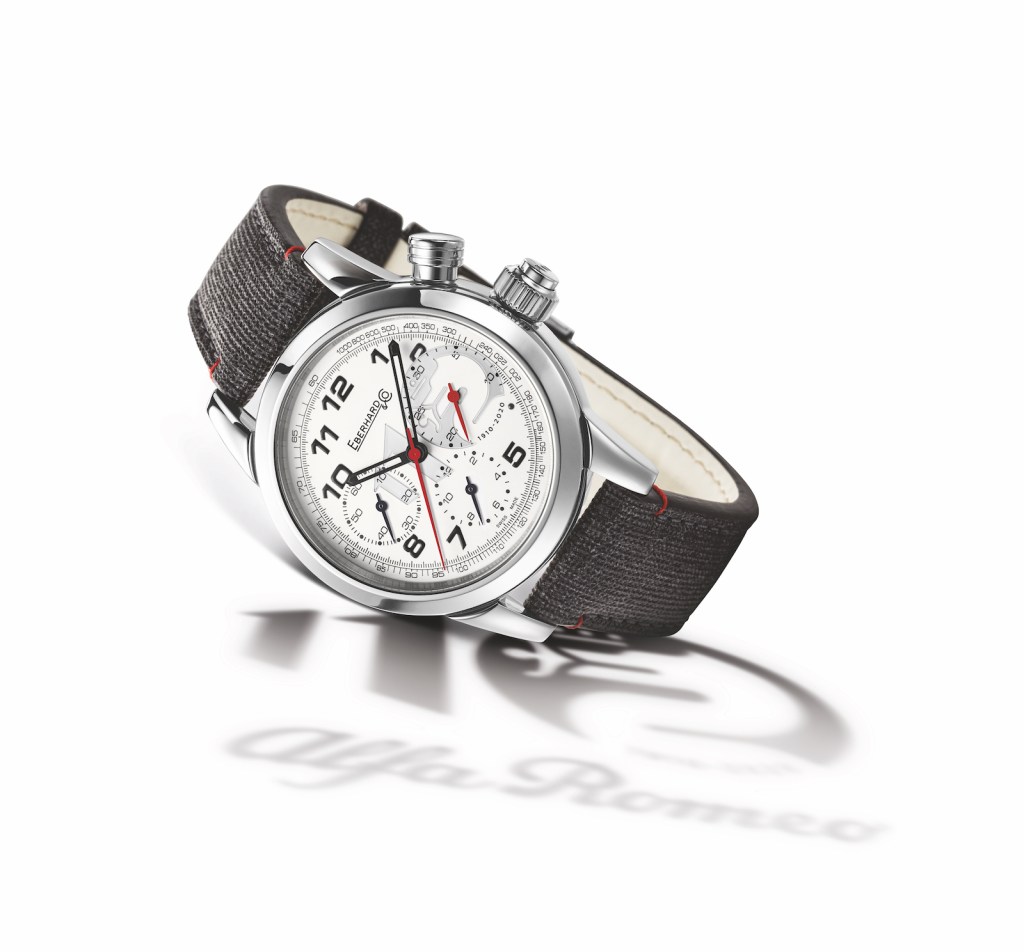 Technology, design and research are all hallmarks of two leading houses: from Switzerland Eberhard & Co. and from Italy Alfa Romeo. The Swiss watch maker is celebrating the 110th anniversary of Alfa Romeo with a new limited edition timepiece available starting in November. The Eberhard & Co. 110th Alfa Romeo Anniversary chronograph has a 42 mm steel case housing an automatic chronograph movement and three counters. Water resistant to 30 meters, the timepiece is outfitted with a flat sapphire glass case back which is personalized with engravings and the Alfa Romeo logo. The tachometer scale on the sporty white dial is inspired by the world of automobiles and features a raised engraving of the new Alfa Romeo celebratory logo. The watch is available with a grey rubberized strap and has been brought out in a limited edition of 110 pieces.