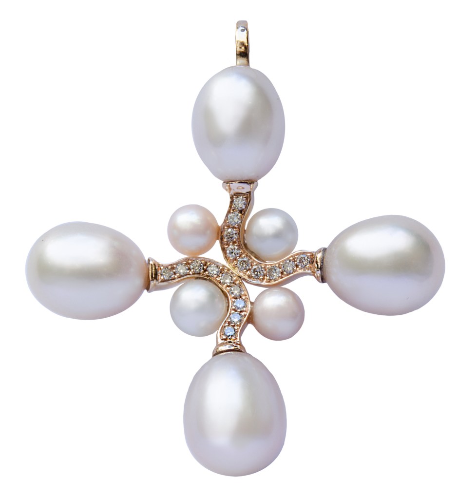 French jewelry designer Isabelle Langlois has brought out two perfect pieces in lustrous cultured pearls as the aptly named Pearls of Character. The pendant in the shape of a cross is punctuated by light pink pearls with smaller pearls in the center magnified by ribbons of pink gold encrusted with diamonds. The highly stylized ring takes the form of a pearl-filled wreath of yellow gold with or without diamonds.