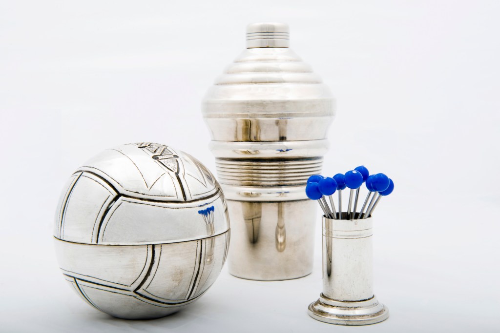 Direction the Marché Serpette in the luxury part of the Paris flea market on the edge of town where collector and gallery owner Olwen Forest, known for her vintage jewelry collections, also officiates over an unparalleled collection of cocktail paraphernalia. Everything you need to make a perfect cocktail and a perfect cocktail hour look is on hand from shakers to ice-buckets, spoons, tongs and cocktail pics all adding up to that perfect cocktail party. The collection of accessories ranges from the superb Art Deco era to the 1980s. If you can’t get to Paris right now The Gourmet Gazette brings this fabulous collection to you for your next visit.