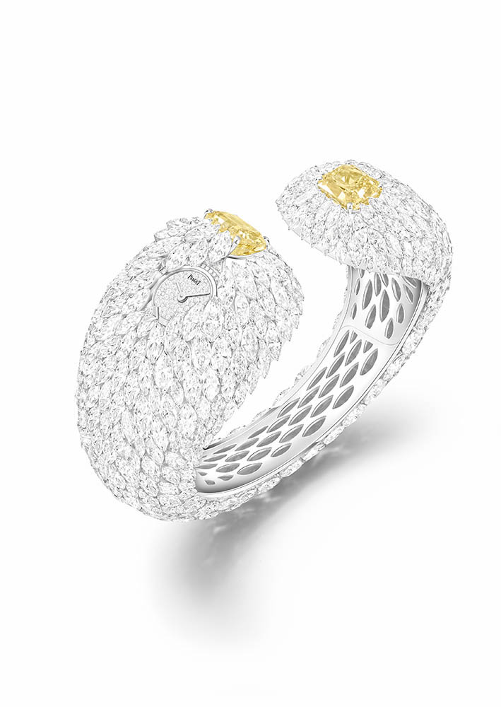 The plumage of Piaget’s bird is embodied in a total of 87.23 carats of the purest of diamonds. Craftsmanship and art come together in the 491 diamonds that are cut into 69 different sizes of the marquise cut, one of the House of Piaget’s signature cuts. It is these gemstones that encase Piaget’s Exquisite Moments Secret Watch. The watch is a unique creation and is outfitted with the Piaget manufacture 56P quartz movement.