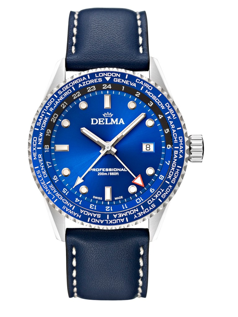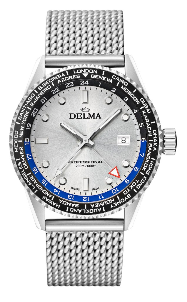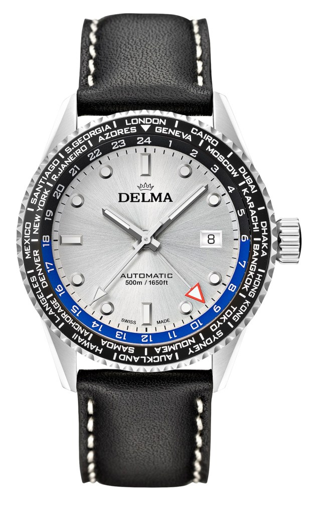Twenty-four reference cities, one for each time zone, complement the polished sunray-brushed dial in nautical black abyss, deep blue and lustrous silver. Luminescent hands and indexes accompany a distinctive triangular 24-hour hand to indicate multiple time zones relevant to the wearer. The watch is outfitted with a Milanese stainless steel bracelet or a leather strap with eye-catching contrasting sticking. The watch with its stainless steel case is available in an automatic version, water resistant to 1,650 feet, or a quartz version, water resistant to 660 feet. The watch comes in a blue Delma designed leather box. Founded in Lengnau, Switzerland in 1924, Delma is an independent family-owned watch brand specialized in the design and manufacture of sports watches.
