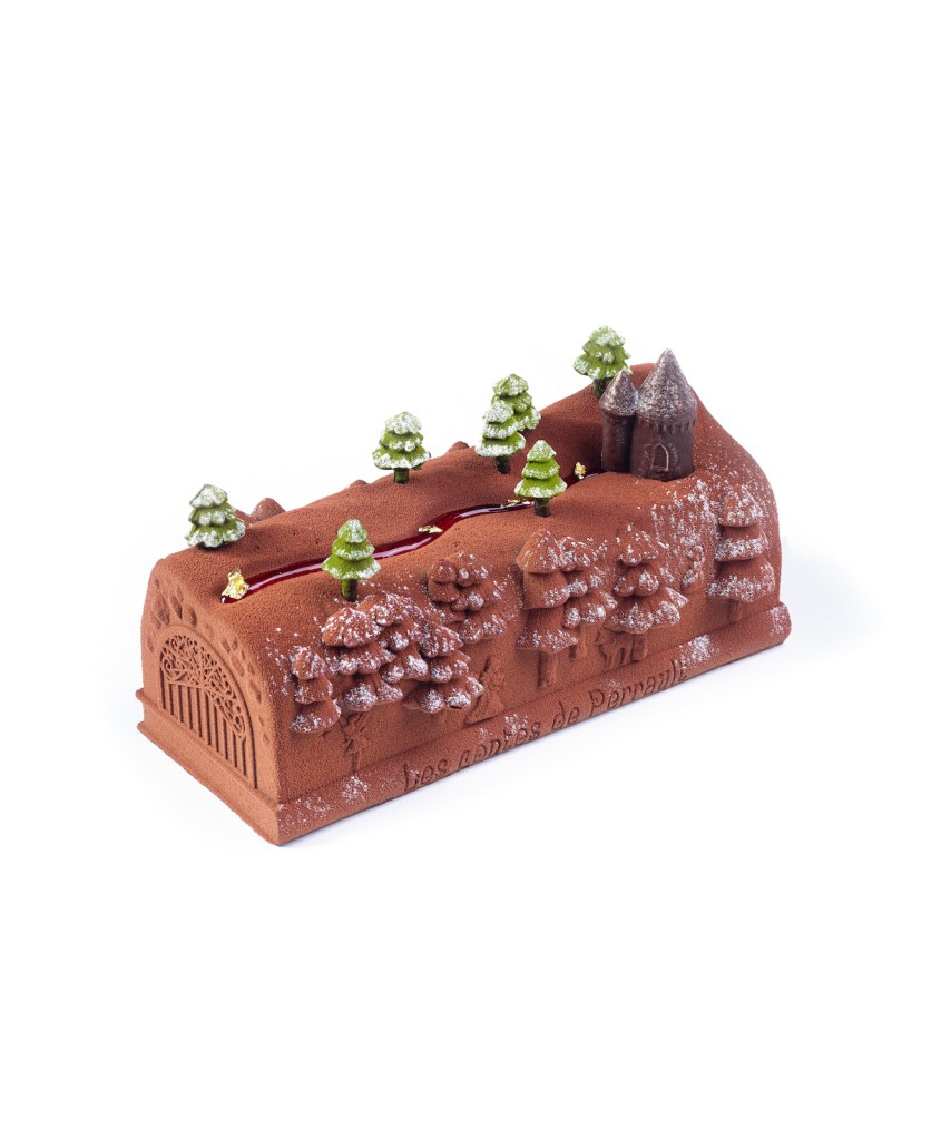 The « Tison », Christmas Bûche from the Prince de Galles Hotel imagined by the house pastry chef Tristan Rousselot who recalled his childhood memories of the wood that had burned in fire place. Made with vegetable charcoal, black sugar mousse, creamy caramel, Haitian chocolate and pine honey. Photo ©Courtesy Le Prince de Galles. Handout via The Gourmet Gazette The Fairy-Tale Woods Bûche by the pastry chef of the Terre Blanche spa and resort, Gaëtan Fiard. The cake draws its inspiration from the huge evergreen trees that surround the resort nestled into the magnificent region of Provence. The dessert bursts with savors of creamy chocolate, pine nuts, citrus fruits and coffee. Photo ©Courtesy Terre Blanche. Handout via The Gourmet Gazette