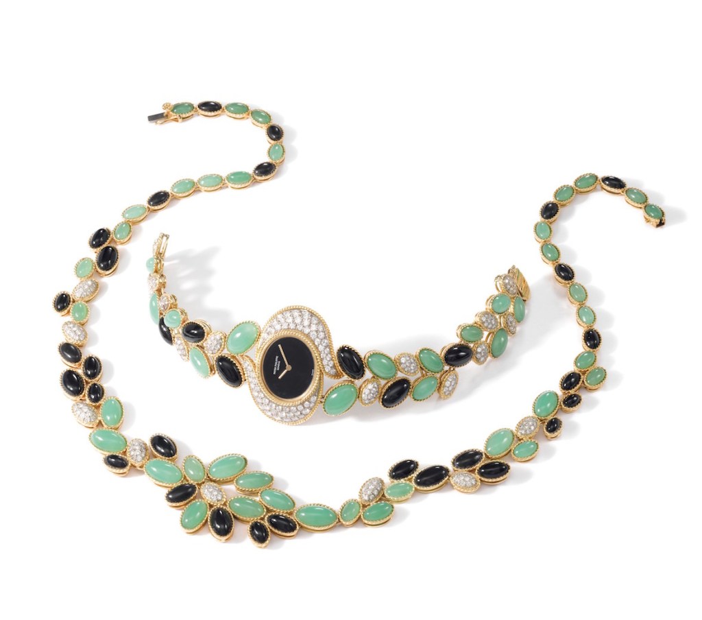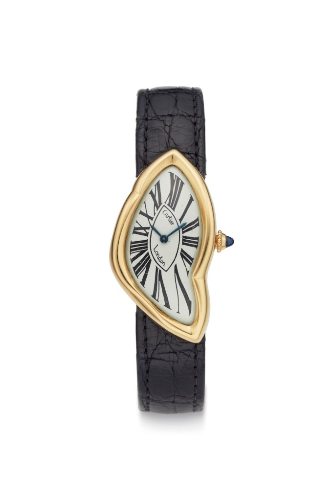 Among the gems on auction was a possibly unique lady’s watch from Patek Philippe. The watch in 18-carat gold with curved pave-set diamond links and a Patek Philippe rope twist bracelet of alternating teardrop-shaped chrysoprase, black onyx and pavé-set diamond links outfitted with a similarly decorated necklace.There was also a Cartier « Crash » London watch, an eye-catching asymmetric 18k gold wristwatch which set a world auction record for this watch.