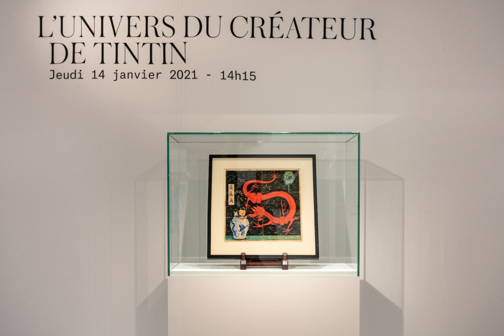 The work evokes the adventures of the young reporter Tintin who is depicted in a Chinese ginger jar accompanied by his ever faithful Snowy, Milou in the original French edition, and a bright red dragon who appears to be terrifying him. The work was acquired by a private collector.