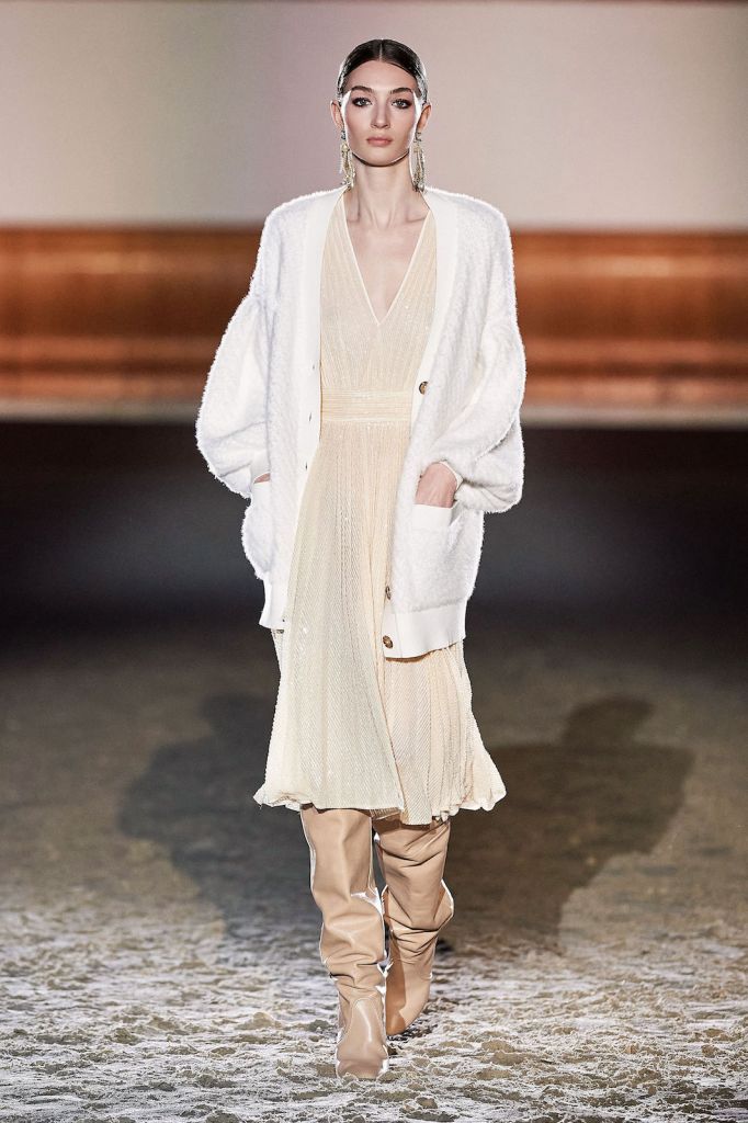 Italian fashion designer Elisabetta Franchi offered an exercise in elegance and style at the Milan Fashion Week last February 28th. Her fall/winter ready-to-wear collection was presented in a refined albeit practically empty decor — given the health situation — recalling the smooth styles of the equestrian world. Beautiful boots, beautifully cut trousers, trenches, skirts and dresses were all on the agenda. Noble materials like tweeds and luxurious leathers evoked all that is aristocratic. While geometrical capes, cardigans and sophisticated dresses rounded out the show.