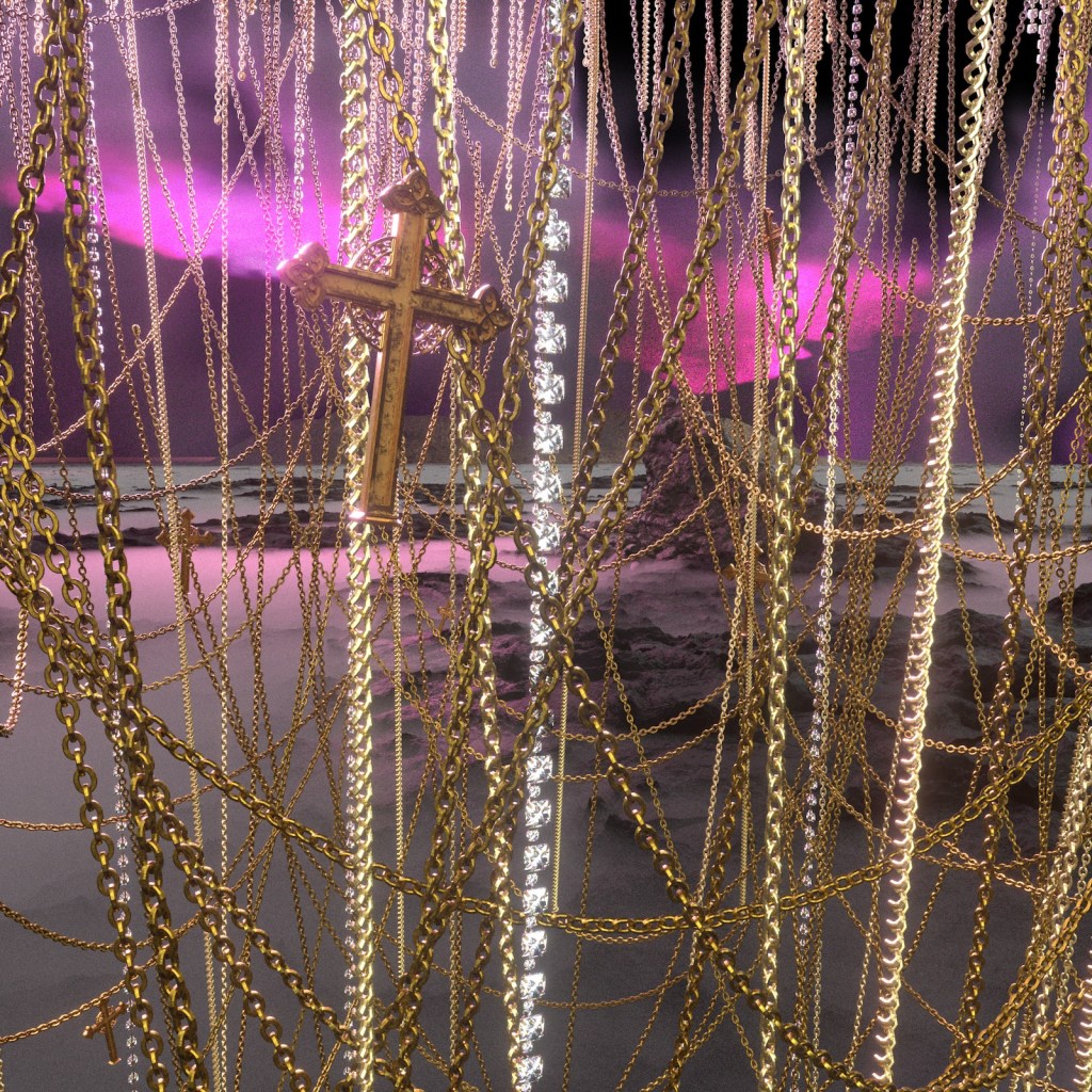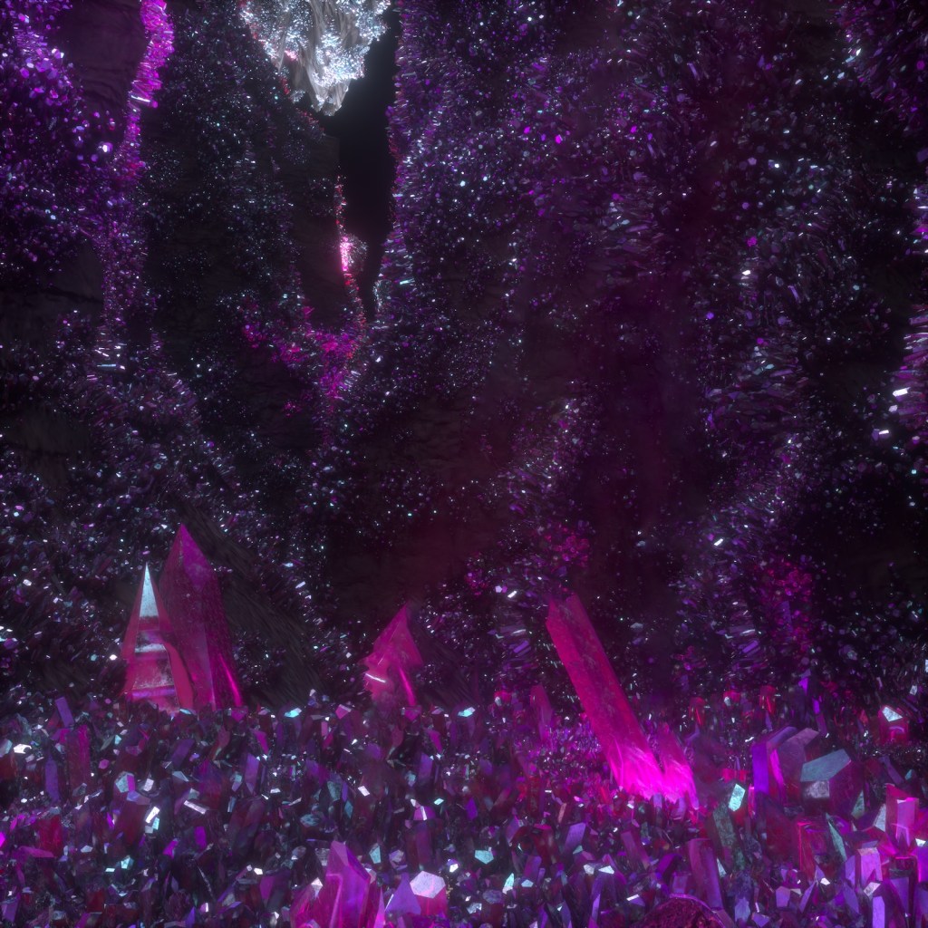 An engaging world of purple crystals from the Tinitus virtual couture presentation of August Getty. Photo Courtesy August Getty. Handout via The Gourmet Gazette