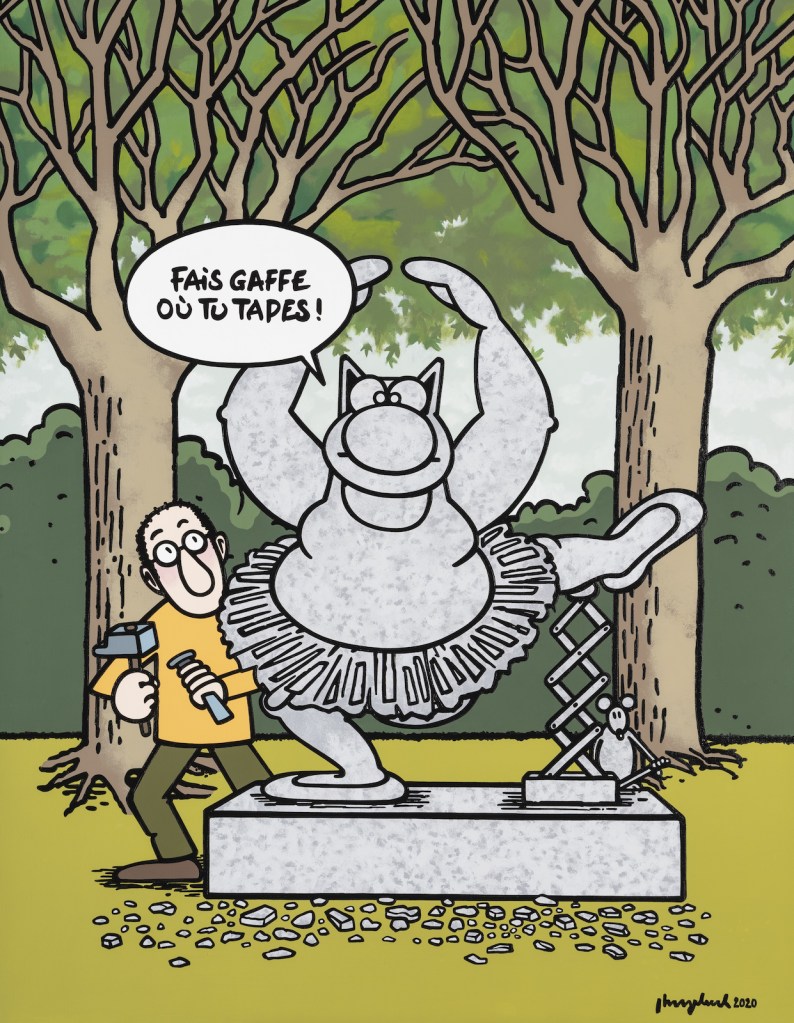The whimsical Cat. Rawhajpoutacha – Rawhajpoutacha, lost wax bronze sculpture, 72 x 42 x 42 cm Rawhajpoutacha – Acrylic on cardboard, 50 x 60 cm. Photo Courtesy Huberty & Breyne. Copyright ©Philippe Geluck. Handout via The Gourmet Gazette