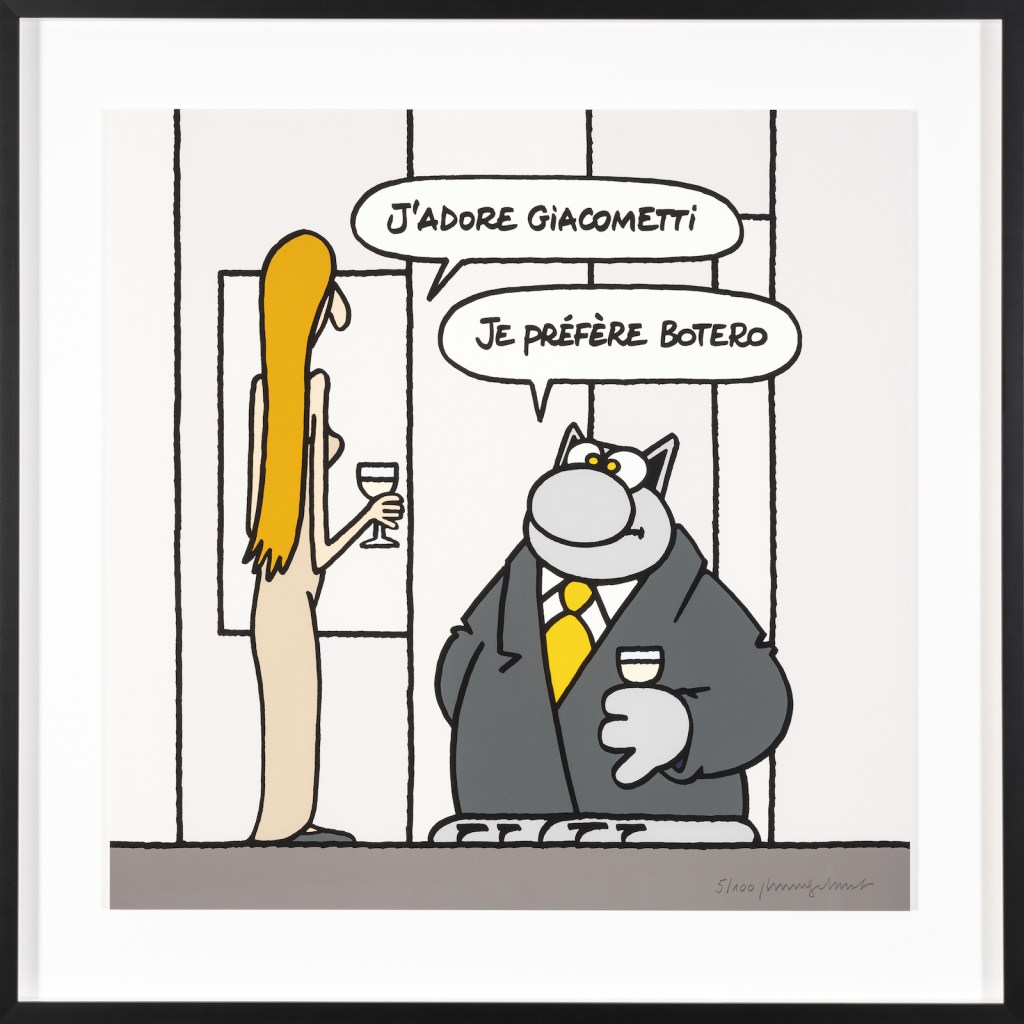 Paris, France —Actor, humorist, television writer and cartoonist, his best-know work is his inimitable comic strip devoted to The Cat, Le Chat in French. He has sold more than 14 million albums worldwide and The Cat (Le Chat )is one of the ten bestselling Franco-Belgian comic strip series of all time. And now the catchy cat from Philippe Geluck is coming to town, first at the Huberty & Breyne gallery which is running a show in conjunction with his monumental sculptures of Le Chat (The Cat) on the Champs-Elysées. So if you are waiting for the galleries to re-open or can’t be in Paris when they do, The Gourmet Gazette brings the exposition Le Chat à Matignon to you.