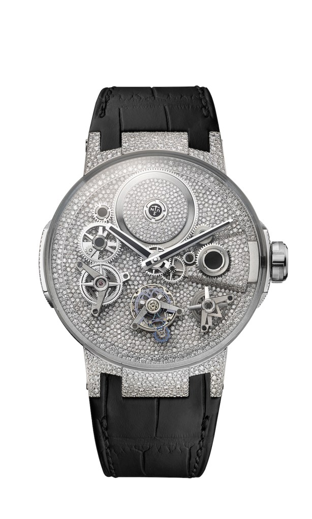 The Sparkling Free Wheel is driven by the houses mechanical UN-176 movement, is outfitted with a flying tourbillon and it is literally paved with diamonds. The Snow-Setting technique was used to set the diamonds into the watch. This technique juxtaposes diamonds of different sizes into a seemingly random pattern that leaves as little metal as possible visible. For the Sparkling Free Wheel watch, which has been brought out in a limited edition of just eight pieces, some 2,251 stones weighing in at 5.9 carats and the setting of the diamondsalone, undertaken by the Geneva-based house of Art Setting, took over 120 hours. The watch is outfitted with a black crocodile strap setting off the bright whiteness of the diamonds.