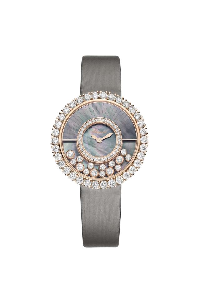 A glowing new watch has emerged to join the sparkling Happy Diamonds Collection from Chopard. The diamonds dance, dance around a mother-of-pearl dial, a magical dance. The 15 dancing diamonds swirl around, sometimes hidden by the mother-of-pearl, sometimes cascading along the lower part of the dial. The center of the timepiece, which is crafted in ethical 18-karat rose gold, is a magical combination of diamonds and Tahitian gray mother-of-pearl with iridescent rainbow reflections and two leaf-shaped hands that tell the time.