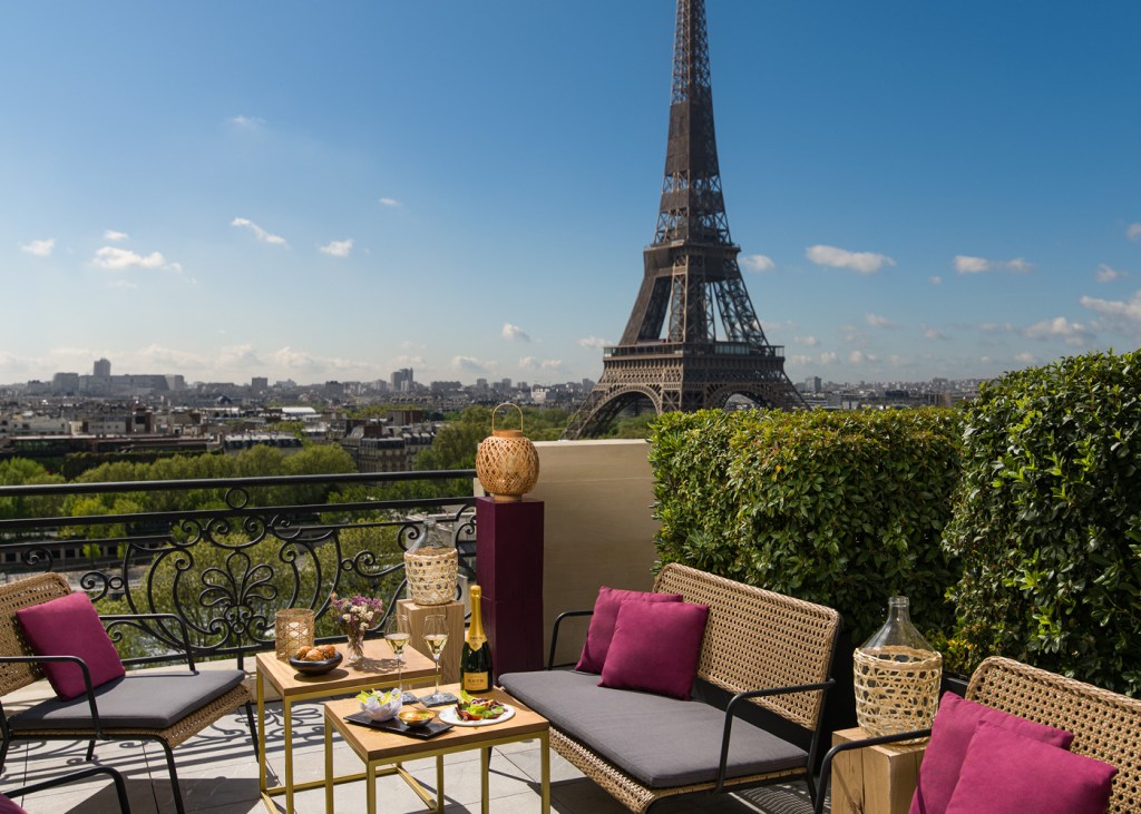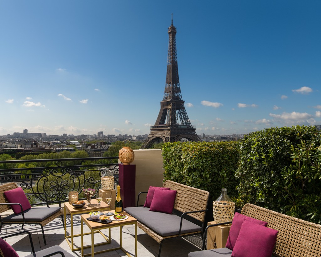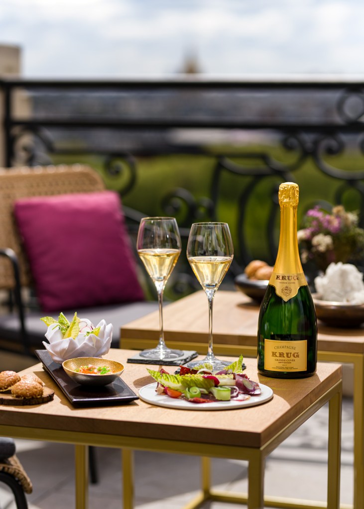 Paris, France — Once again the house of Krug is hosting its outdoor and indoor summer terrace at the prestigious Shangri-La Hotel in Paris. This is one of The Gourmet Gazette’s favorite Champagne Times and it opens tonight, June 1st, and remains on the agenda until the end of September. Perched on the fourth floor of the hotel, the terrace overlooks the Eiffel Tower, offering an unobstructed view of what is arguably the world’s most famous monument.