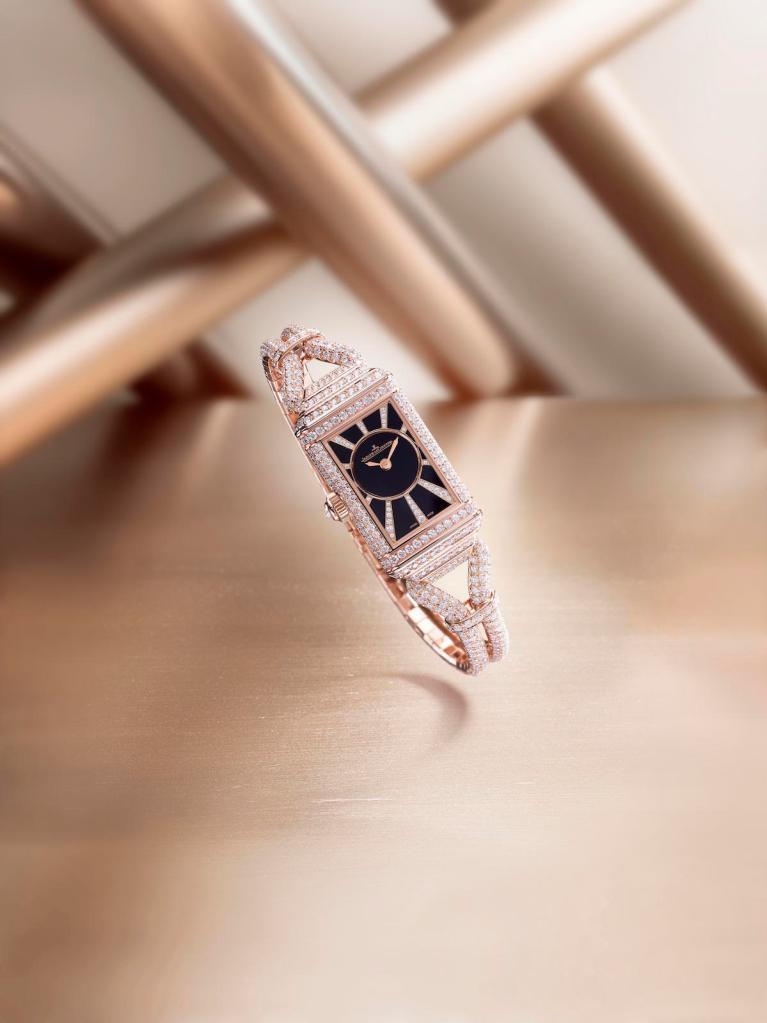 For 2021, the Reverso One Cordonnet Jewelry this exquisite pairing takes on enhanced radiance for the cordonnet bracelet has been transformed into a supple braid of gold and diamonds uniting it with a fully diamond-set Duetto pink gold case. The front dial is in mother-of- pearl, diamonds and applied numerals while the back dial is in onyx with diamond-set indexes.