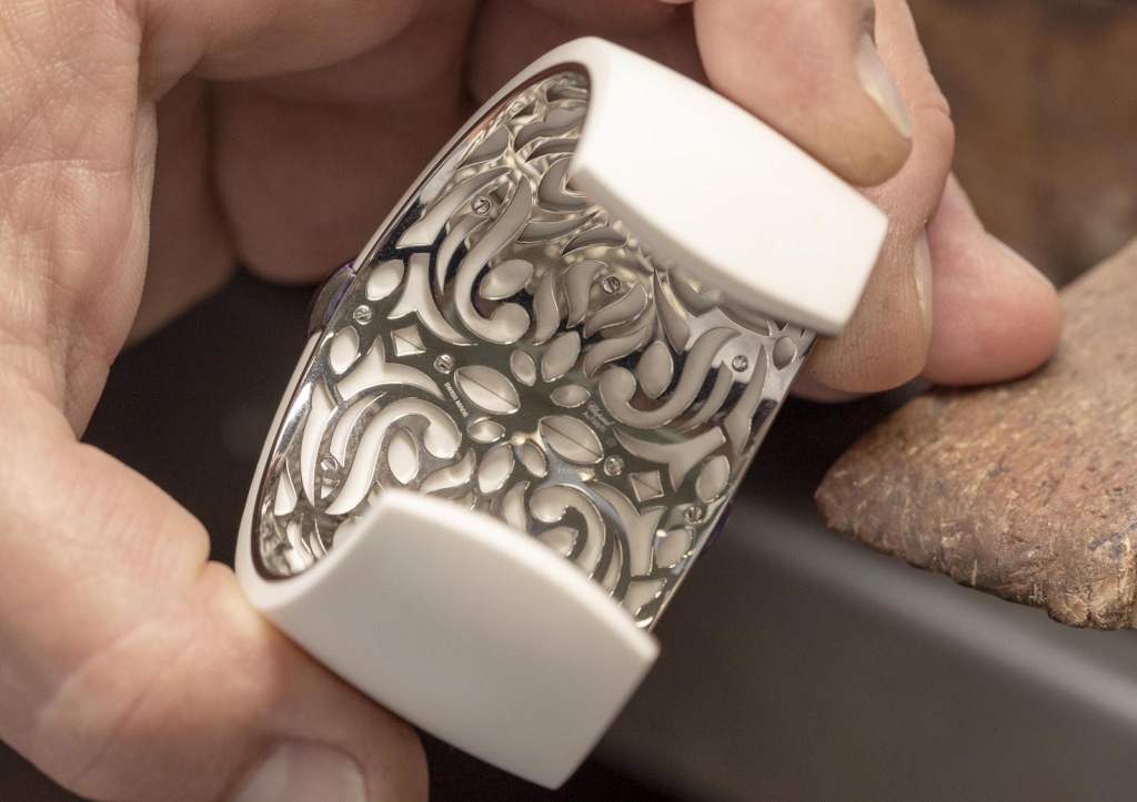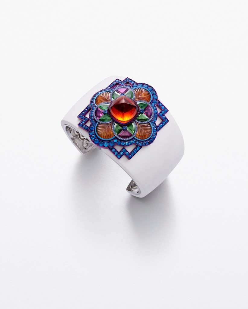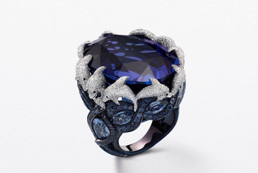 This year’s Haute Joaillerie collection of 74 creations, the number of creations corresponds to the number of years since the Cannes Festival first began, is a lively and imaginative collection radiating energy and a rich, dreamy universe outfitted with lush gemstones fittingly entitled Paradise. Among the expressive pieces is a flamboyant double necklace choker interlacing yellow diamonds and adorned with a 30.68 fancy vivid yellow diamond. Immersed in a sea of sapphires is the dolphins ring which depicts these delightful creatures dancing around a magnificent 59-carat oval tanzanite. There is a sublime bracelet with a colorful and graphic central motif embellished with garnets, tsavorites and tourmalines. We give you a sneak peak of the making in the gallery above.