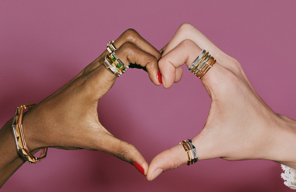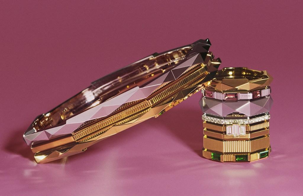 It’s contemporary, it’s timeless, it’s unisex, it’s luxurious it’s Gucci’s Link to Love Collection representing the infinite cycles of life and love. Refined lines, geometric lines literally create a link to love. The collection from the house’s creative director Alessandro Michele of rings, bracelets and necklaces employs three colors of 18 carat gold: yellow, white and pink.
