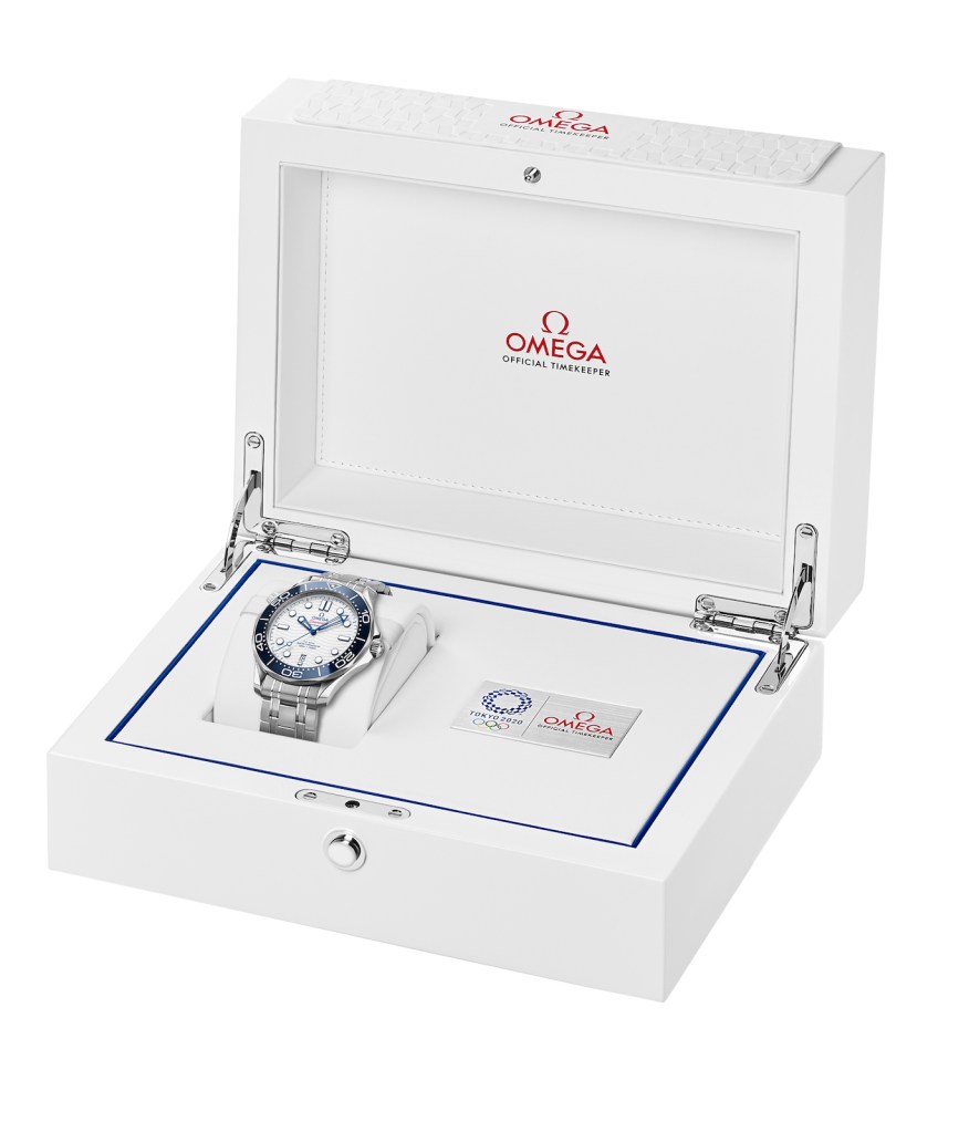 The Omega Seamaster Diver 300M Tokyo 2020 in its presentation box. Photo Courtesy Omega. Handout via The Gourmet Gazette