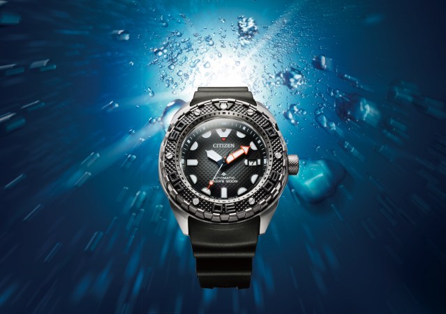 In this new timepiece, Citizen reveals its Caliber 9051, a new automatic movement using anti-magnetic materials to strengthen the magnetic resistance of the watch. The surprisingly lightweight watch is ultra large which should make it appealing to divers and it has a massive bezel and a domed sapphire crystal. its handsome black dial is finished with an attractive hobnail pattern known as clou de Paris which literally means nails of Paris while the crucial minute and seconds hands are in orange with a luminescent coating for high visibility underwater. The professional diver’s watch is outfitted with a long rubber strap that can be lengthened with an extension for it to be worn over a wet suit.