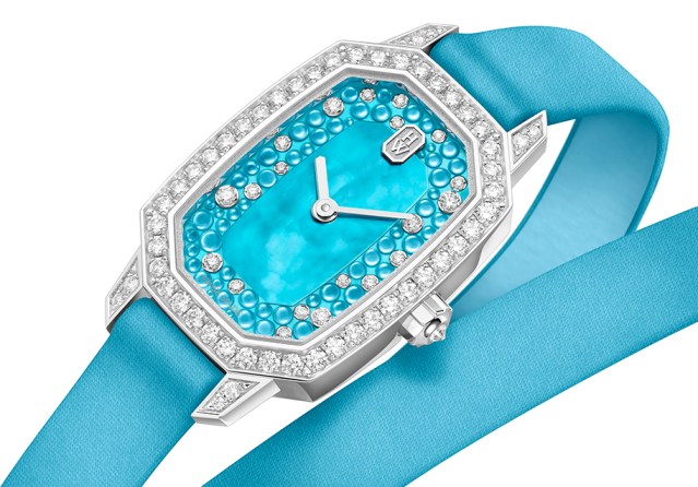 Set around the perimeter of the dial are cabochons crafted from natural mother-of-pearl and the cabochons in turn are enlivened by 20 brilliant-cut sparkling diamonds while the central section of the dial is covered with a layer of beaded mother-of-pearl. The dial is nestled into an elegant octagonal 18-carat white gold case which is set with 53 brilliant-cut diamonds which illuminate the dial with their icy radiant light.