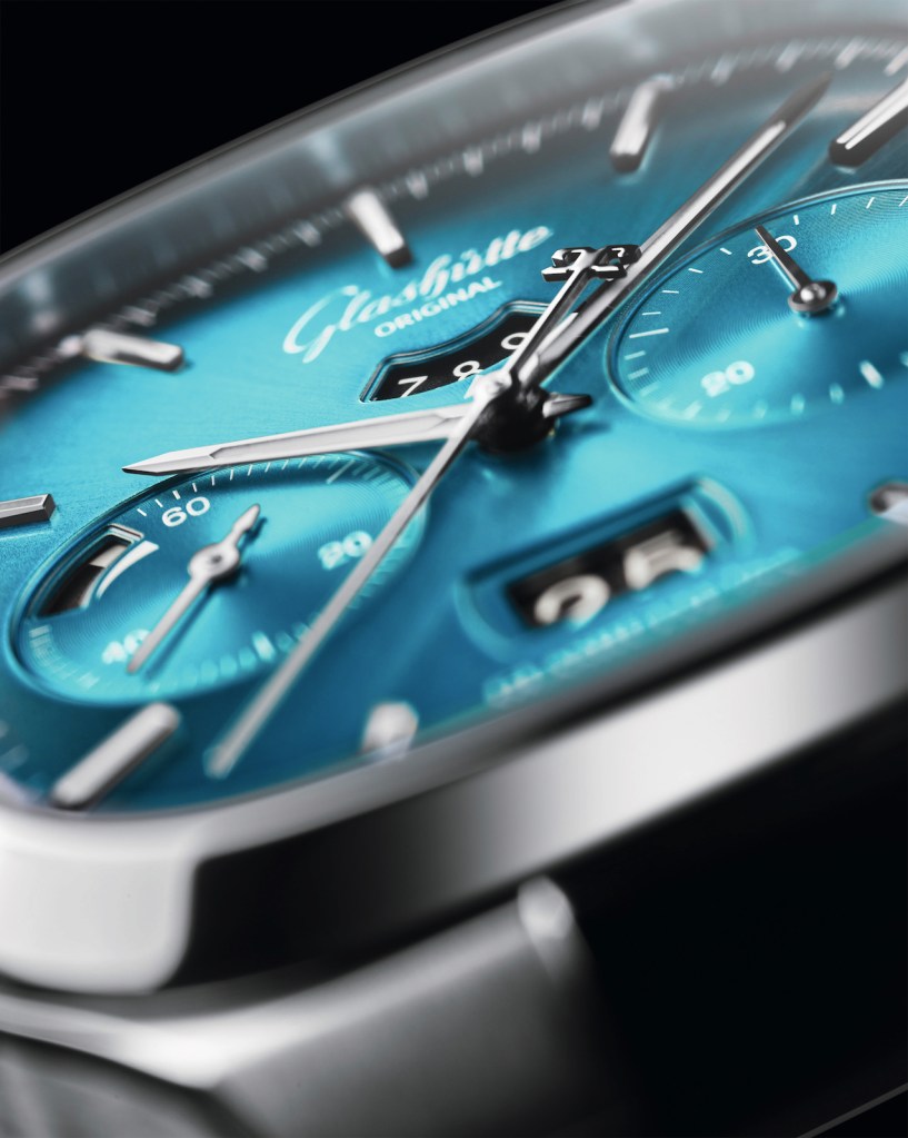 The Seventies Chronograph Panorama Date model in turquoise from Glashütte Original. Photo ©Glashütte Original. Handout via The Gourmet Gazette