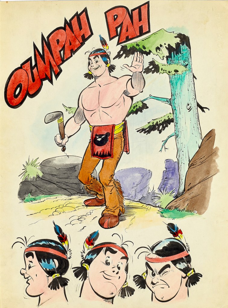 Alberto Uderzo was born in France in 1927 to Italian immigrants, color blind and with 12 fingers, not exactly the ideal characteristics for a future illustrator. But illustrator he became, one of the best known in the world. He would find his road, his path and his own magic potion, working morning, noon and night at his drawing table. His encounter with Goscinny on the Champs-Elysées would translate into— most famously — the Adventures of Asterix, born in 1959 which has bequeathed some 1,1450 plates, many of which can be seen at the show, which also explores his collaboration with the print press, with Pilote and with Goscinny on Oomph-Pah, the American Indian, a series which preceded Asterix.