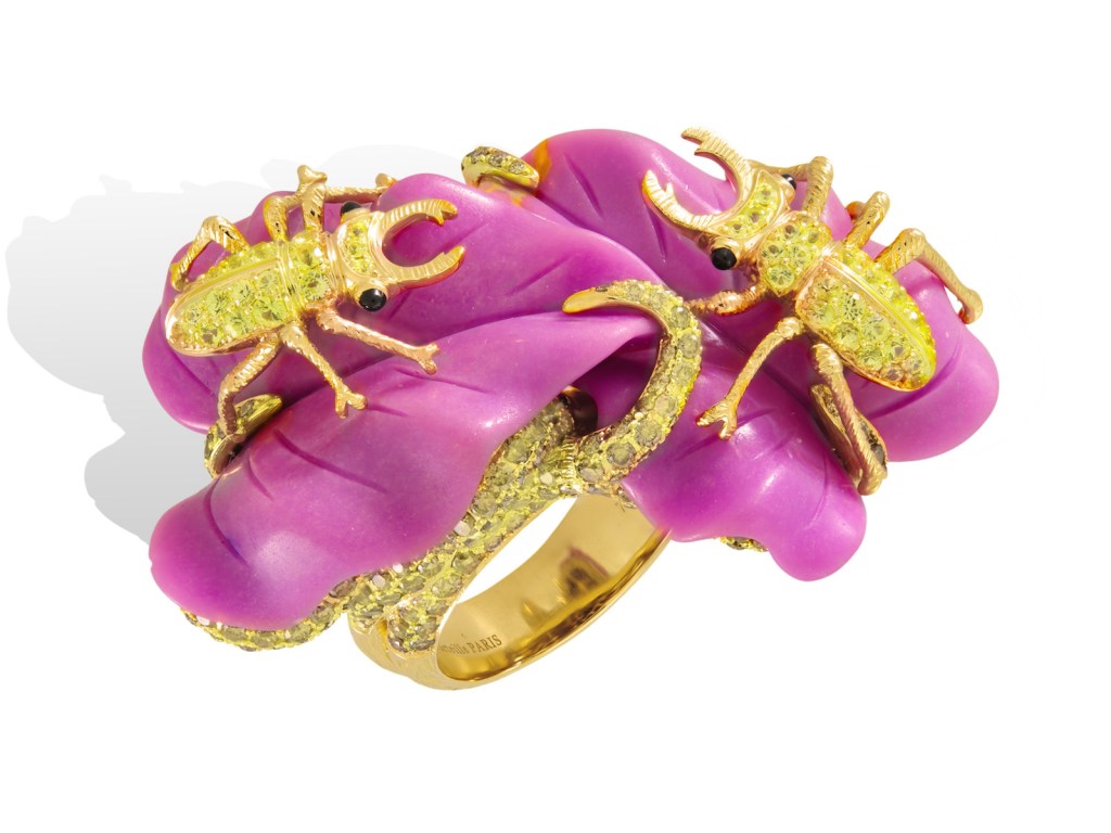 Ring in gold, brown diamonds, sapphires and phosphosiderites presented by Lydia Courteille. Photo©Lydia Courteille. Courtesy Timeless Jewels. Handout via The Gourmet Gazette