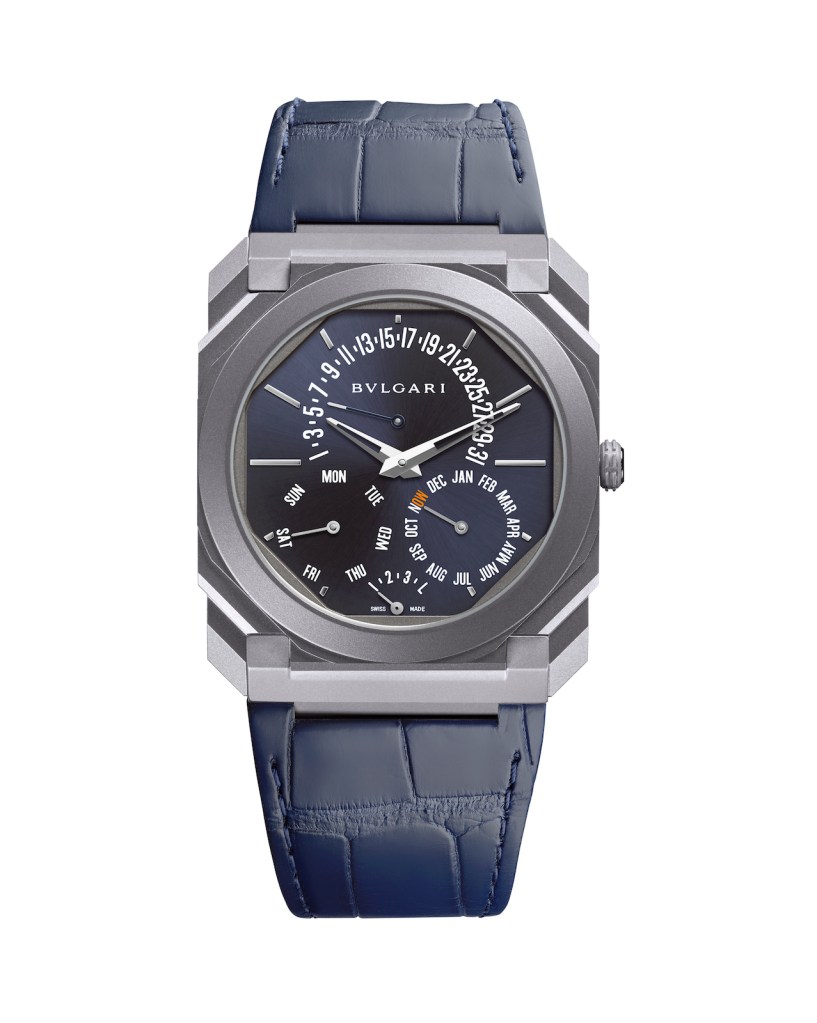 From the house of Bulgari, the Octo Finissimo Perpetual Calendar Tantalum. The case of this watch is fashioned in an extremely rare metal, tantalum and is outfitted with a mechanical self-winding movement, the Manufacture BVL Calibre 305 and a 60-hour power reserve. Photo courtesy Only Watch. Handout via The Gourmet Gazette