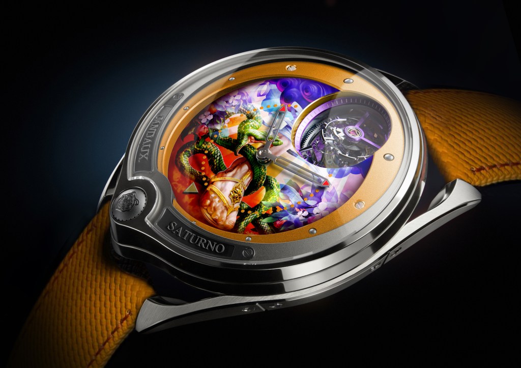 From the house of David Candaux, the DC7 Genesis Unique Piece by Candaux and Saturno. The house worked with the artist Mikki Saturn to create this exceptional handcrafted timepiece with a miniature painting and outfitted with a flying tourbillon. Photo courtesy Only Watch. Handout via The Gourmet Gazette