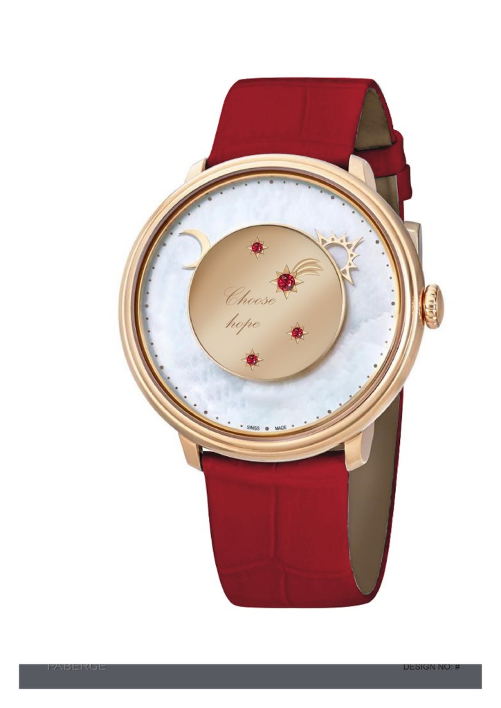 From the house of Fabergé, the Dalliance Choose Hope watch. This high-jewellery watch features a mother-of-pearl dial in a 36mm 18k rose gold case with an alligator strap while its hand-engraved central dial features an array of vibrant rubies.Photo courtesy Only Watch. Handout via The Gourmet Gazette