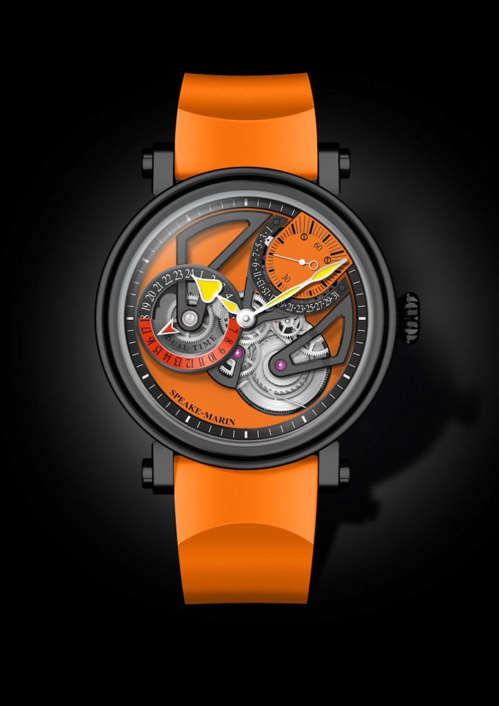 From the house of Speake-Marin, the One & Two Dual Time Only Watch the Sun. This timepiece enjoys a powerful open worked dial with a black mate finish and is outfitted with an SMA02 in house-movement. Photo courtesy Only Watch. Handout via The Gourmet Gazette