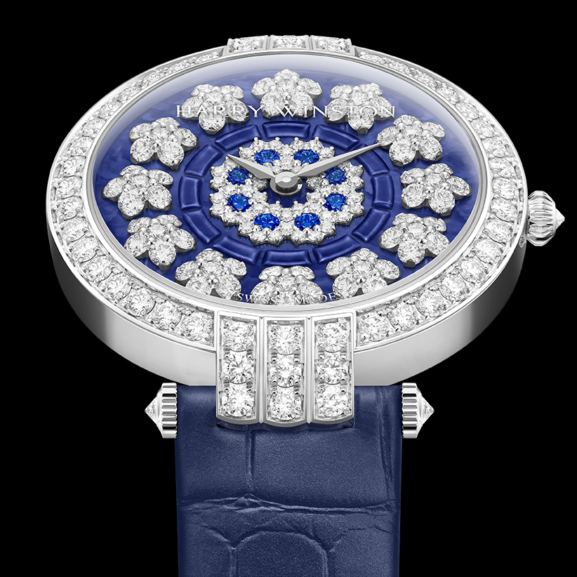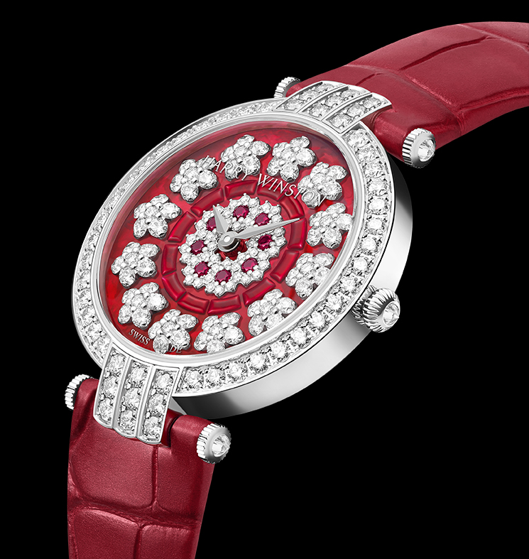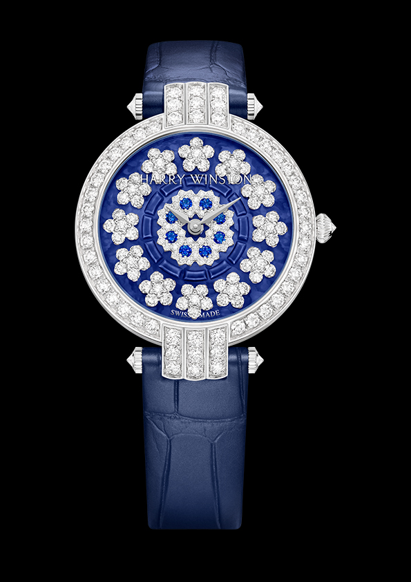 The mother-of-pearl dials are masterpieces in and of themselves as the designers at Harry Winston have created three-dimensional shapes. The timepieces feature a fiery red or royal blue beaded mother-of-pearl background adorned with twelve nacre cabochons. Meanwhile 12 sunflowers composed of brilliant-cut diamonds mark the hours and the center of the dial envelops eight smaller flowers with diamond petals and ruby or sapphire hearts.