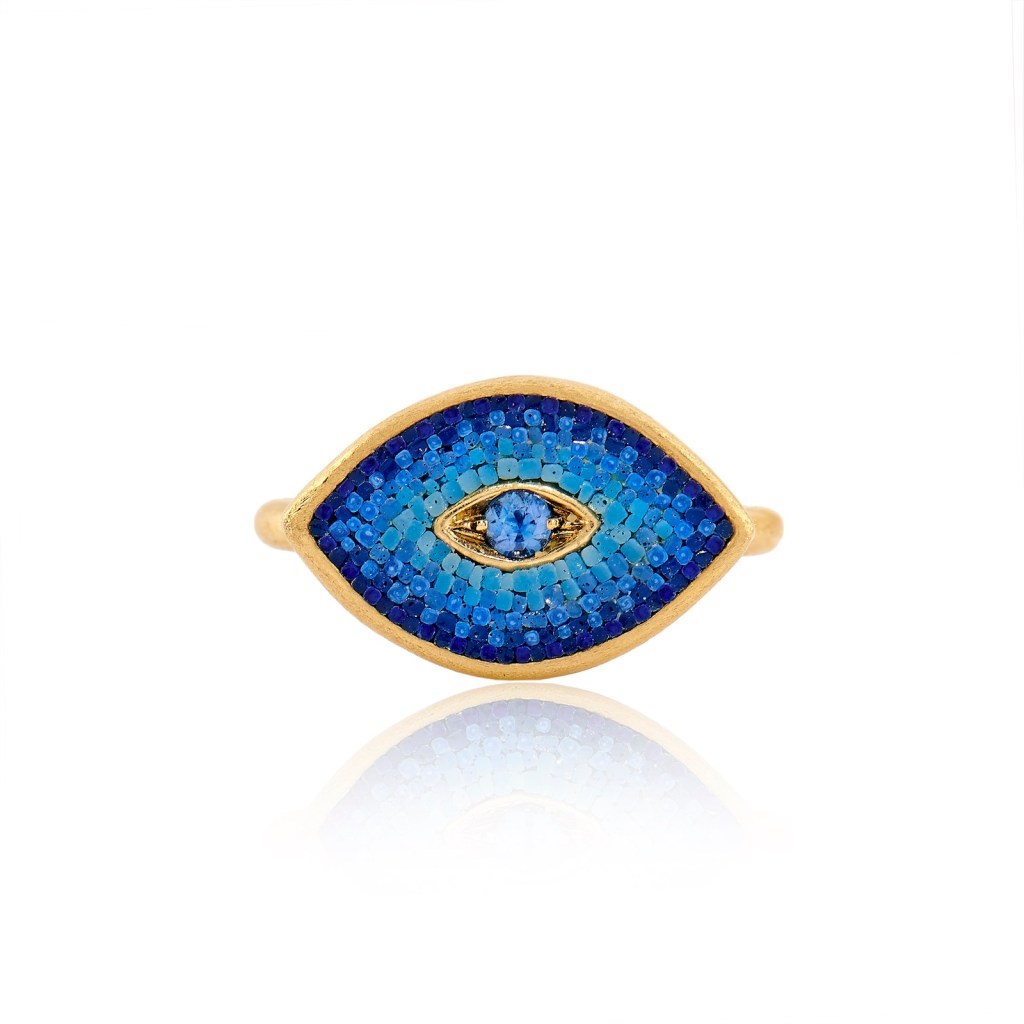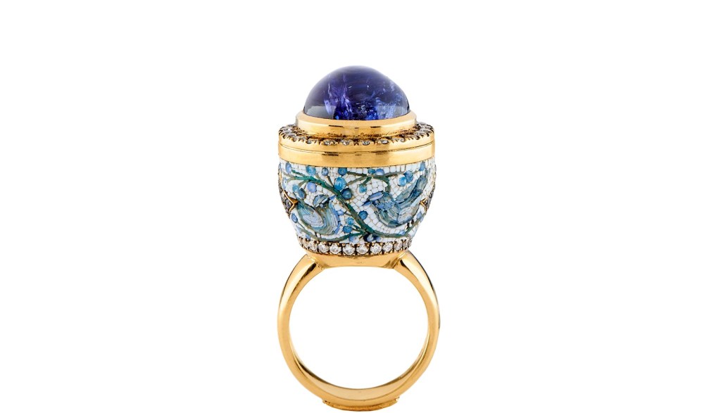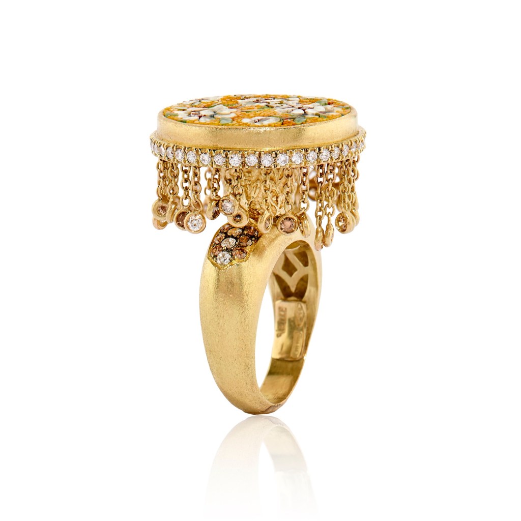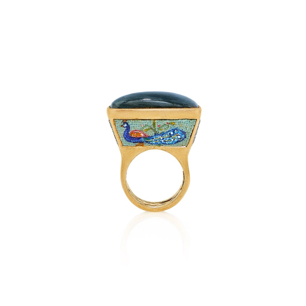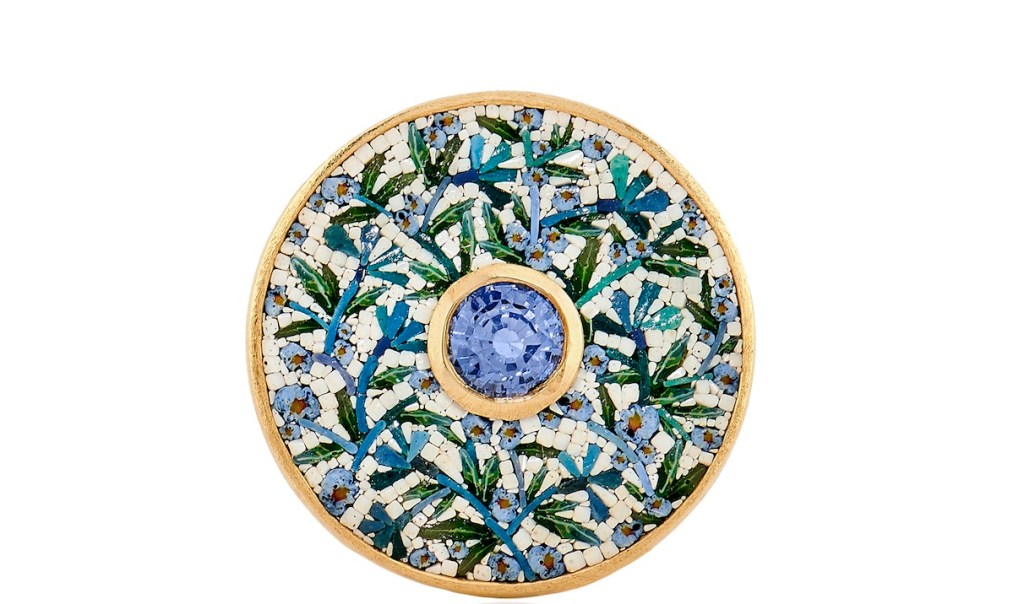Rome, Italy —A tiny mandala, the falcon-headed god of the Ancient Egyptians, Horus, a brilliant blue paying tribute to Lalique and an emerald-green sparkling leaf are just a few of the high art mosaic rings from the Roman house of Le Sibille. It’s a story of labor, craftsmanship and detail. Micro mosaic jewelry reached its height in 19th century Italy. This is jewelry as art which draws its inspiration from traditional mosaics but seriously scaled down in size. Micro mosaics are created rom tiny fragments of tesserae which is generally made from glass or enable and set in a way to form small picture.