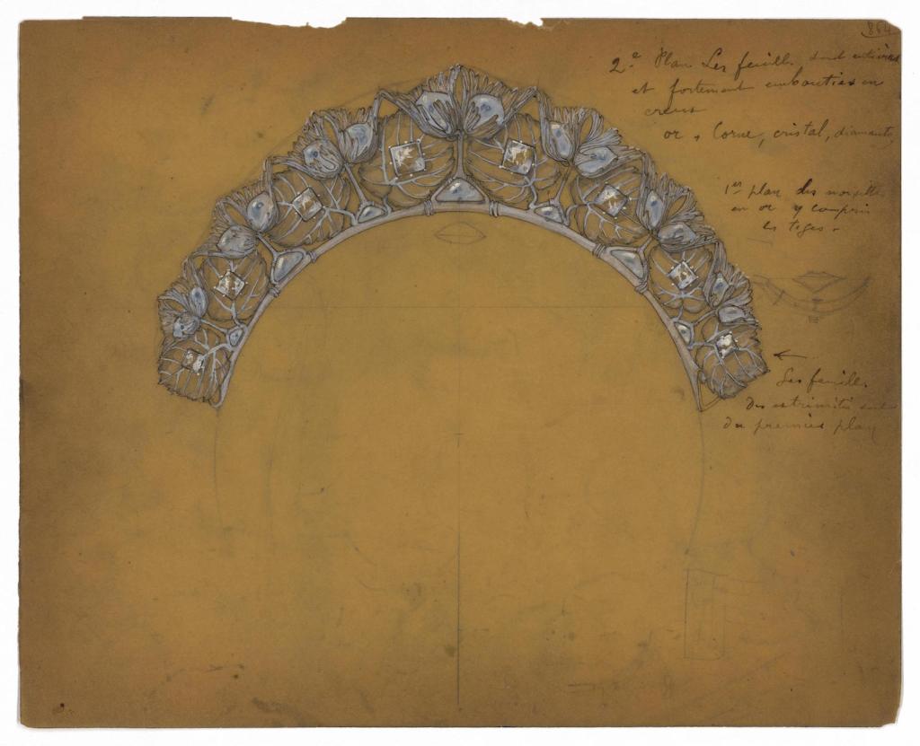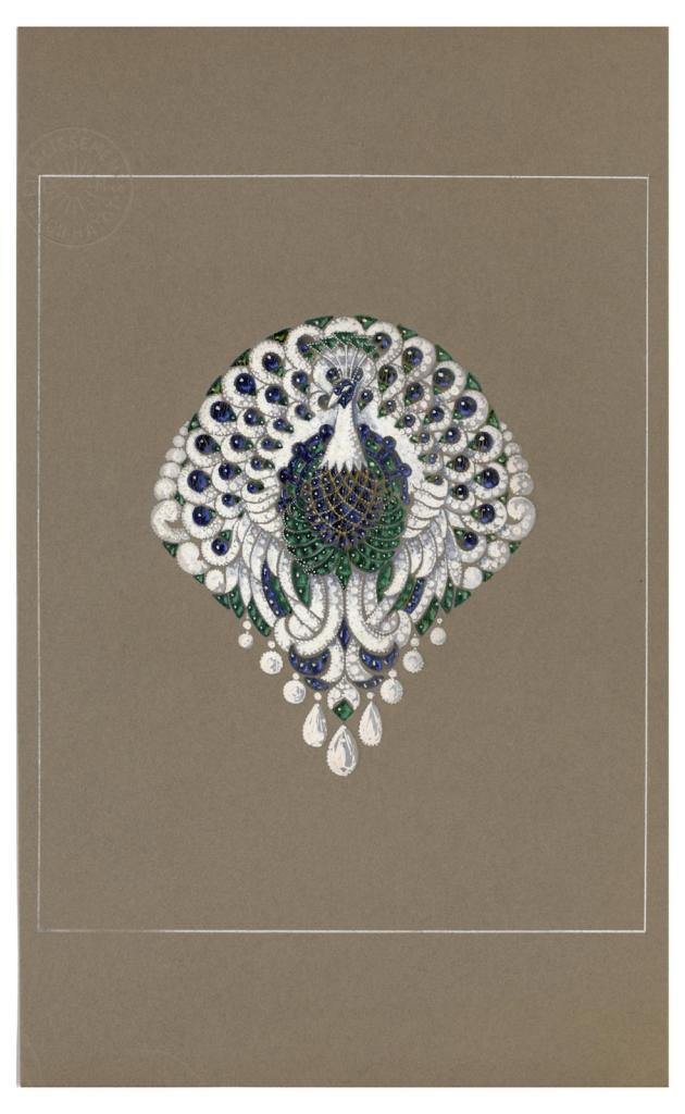 Tiaras, a main stay of royalty, are abundant in the show with seizing drawings by René Lalique who was trained as both a jeweler and an artist. There is a scintillating pair of drawings, circa 1911, by the Atelier Brédillard-Hatot for a pendant watch. While another drawing by Léon Hatot offers a sublime peacock, one of the most emblematic symbols in 19th century jewelry.