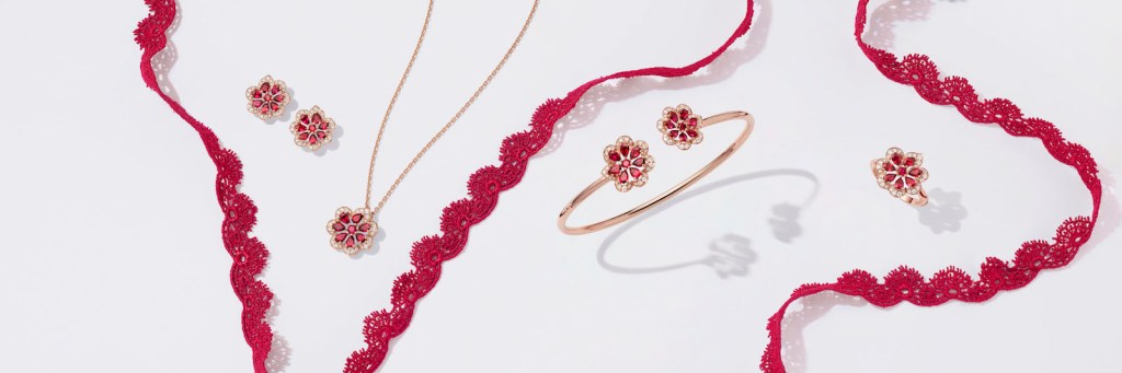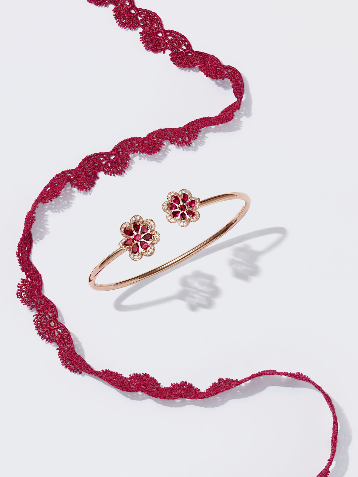 The pieces echo the scrolls and squiggles of scalloped antique lace while pear-shaped ruby petals emerge on the ring, earrings, pendant and bangle that compose the latest additions to the collection. The deep red color of rubies associated them with blood, love and passion. Meanwhile the art of lacemaking was perfected in Venice in the 16th century spreading across Europe to Belgium, France, Spain and England. The Precious Lace collection embraces the hallmarks of the house of Chopard, noble materials, a flair for details and the supreme skill of the house’s arts and crafts men and women.
