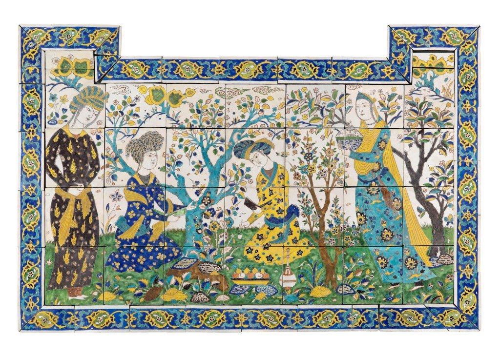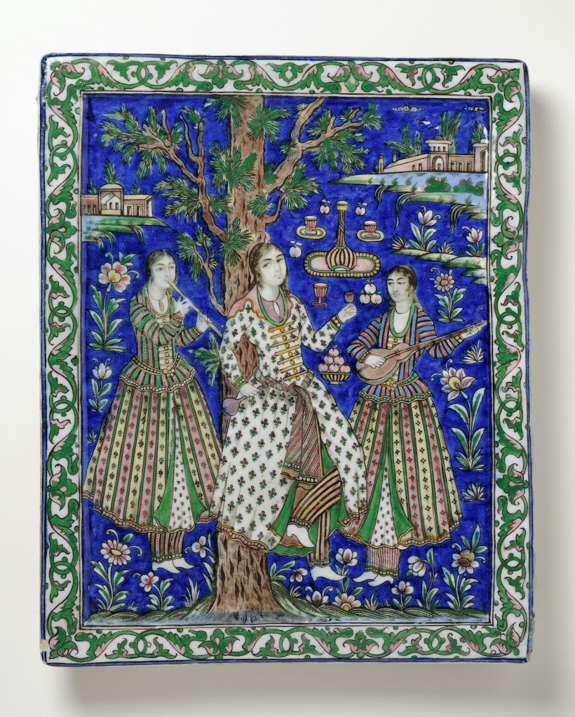A wall panel from Iran, early 19th century, depicting three musicians on display at the exhibition in Rillieux-la-Pape. ©Lyon MBA – Photo Alain Basset. Handout via The Gourmet Gazette