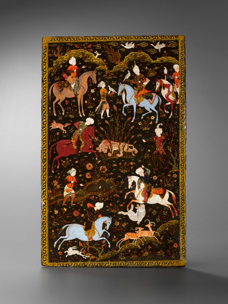 Cover of a book binding depicting a prince enjoying himself in a natural setting, attributed to Tabriz, Iran, circa 1550 in paint on paper mâché on display at the Mantes La Jolie exhibition. ©Musée du Louvre, Dist. RMN-Grand Palais / Hughes Dubois