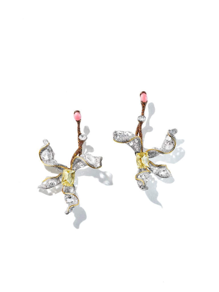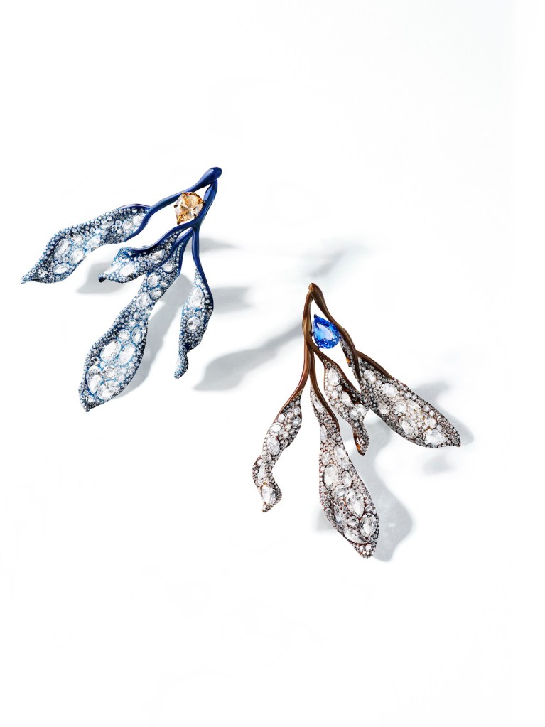 Both the centuries-old cire-perdu wax sculpting technique and modern-day titanium manipulation were used to create the feather and the dragonfly, which are among her signature motifs. The Four Seasons collection has welcomed a new member, the Fruit Earrings, which embrace rarely seen emerald-cut fancy dark brown-yellow diamonds weighing more than 16 carats each.