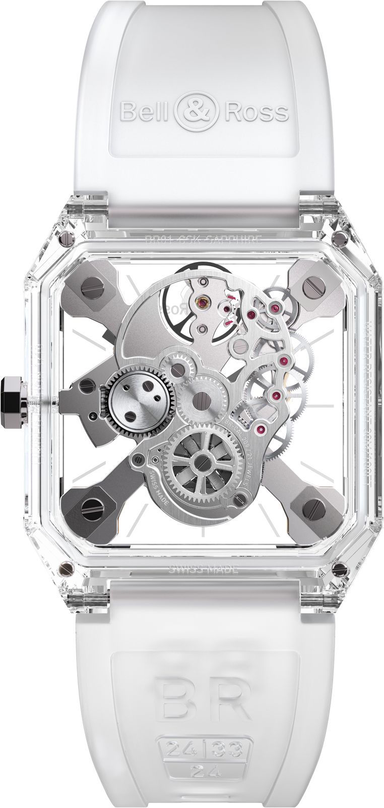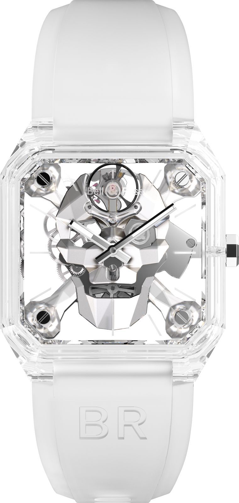 The Cyber Skull Sapphire, which has been brought out in a very limited edition of only 10 pieces, ticks in on the heels of, among others, the Burning Skull in 2016 with the skull surrounded by flames and the 2018 Laughing Skull whose jaws move when winding the crown and the somewhat spooky skull seems to be laughing. The BR 01 Cyber Skull Sapphire has been developed entirely in colorless sapphire crystal and even its rubber strap is translucent. The skull and crossbones are captured between two sapphire crystals and appear to float on the wrist. The sapphire crystal is a precious block of very hard glass and a material that is very difficult to shape leaving no margin for error, otherwise it means starting all over again. The manual winding watch houses a BR-CAL.209 in-house movement and it is nearly invisible. The timepiece is water resistant to 30 meters.