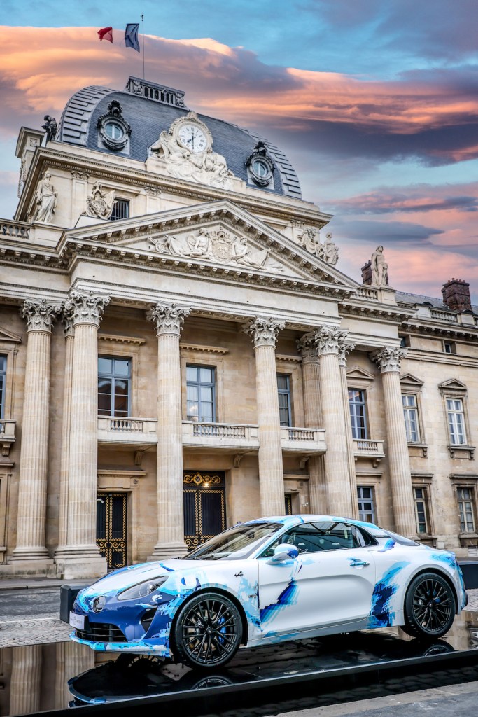 Paris, France — It was one of the mythical French racing and sports cars, the Alpine, invented in the 1950s it made a comeback in 2018 and entered into a new era for art and innovation this spring in Paris. Alpine unveiled the A110 Sastruga at Art Paris, a leading modern and contemporary art fair in Paris last April 6th. The unique car was wearing the colors of Obvious, a collective of artists and researchers that has pioneered the use of artificial intelligence in art. The jazzy looking Alpine with its mosaics and designs in myriad shades of blue proved to be a real eye catcher and star of the fair as it sat in front of the temporary Grand Palais exhibition center with the Eiffel Tower as a dramatic backdrop and the Ecole Militaire.