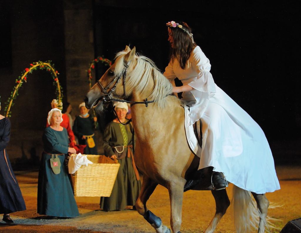 The 75-minute show brings 500 local residents, known as Meldois in honor of the Meldi the ancient Gaulish tribe that lived in the region, into the spotlight who volunteer their time with gusto and plenty of hard work and go through between three to six costume changes throughout the evening. Even the town’s children get into the act and for some families three generations have sung, danced, or acted in the show which also features state-of-the-art special effects and lighting and riders on horseback. There are some 900 projectors, 300 light displays, 2,500 costumes —they change costumes in the cathedral — made also by the local people, and myriad props and sets all worthy of a block buster production.
