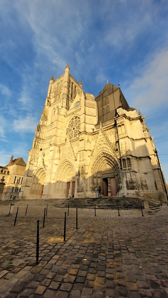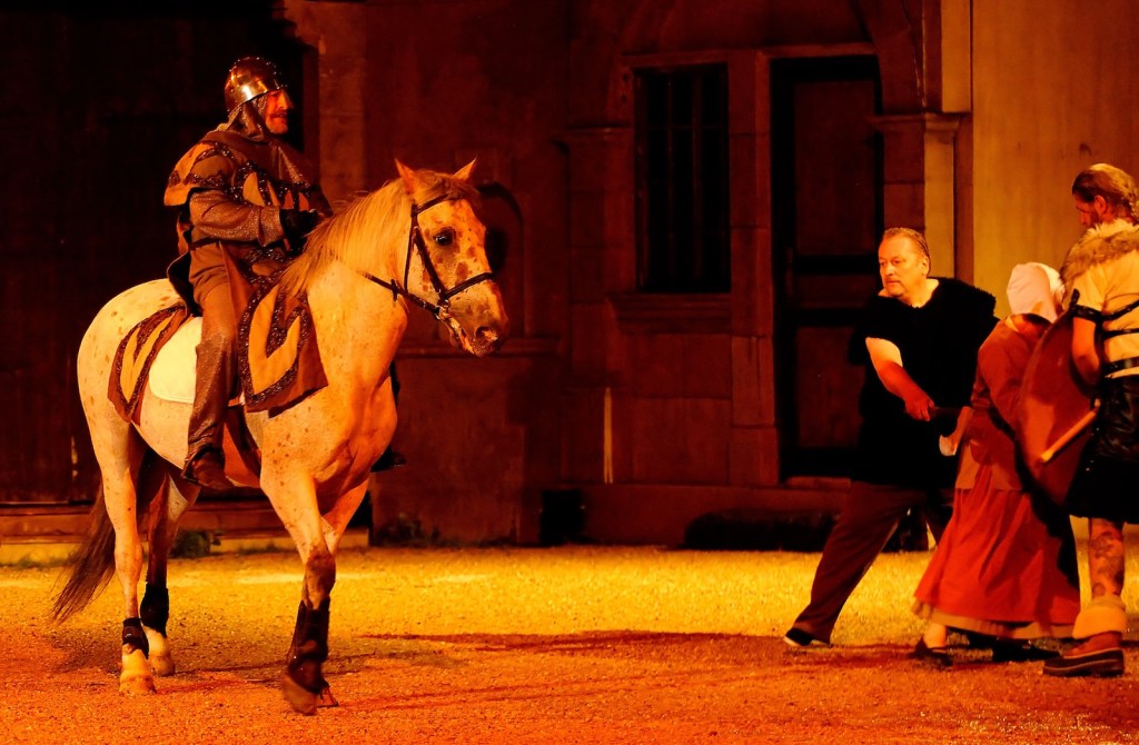 Claude, a retired teacher, is Bishop Jacques-Bénigne Bossuet, the great preacher, the emblematic and powerful 17th century bishop of Meaux, who was known as the Eagle of Meaux, because like the eagle he was able to look straight into the sun, in his case meaning the Sun King Louis XIV. But Claude is also a local peasant killed by a Viking in the first part of the show and a soldier returning from the World War I front in one of the closing scenes. It is a captivating concept with the viewing grandstands sheltered by the mighty cathedral which for the eight shows doubles as a changing room for the players. It looks like a flea market as the actors and actresses file in with their thick slipcovers holding their costumes that they picked up in « wardrobe » in an outer building of the cathedral across the courtyard. The air is clearly electric while the people of Meaux get ready for the evening’s performance.