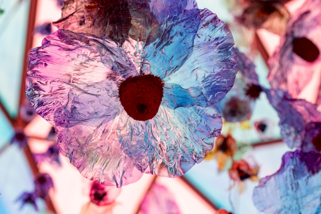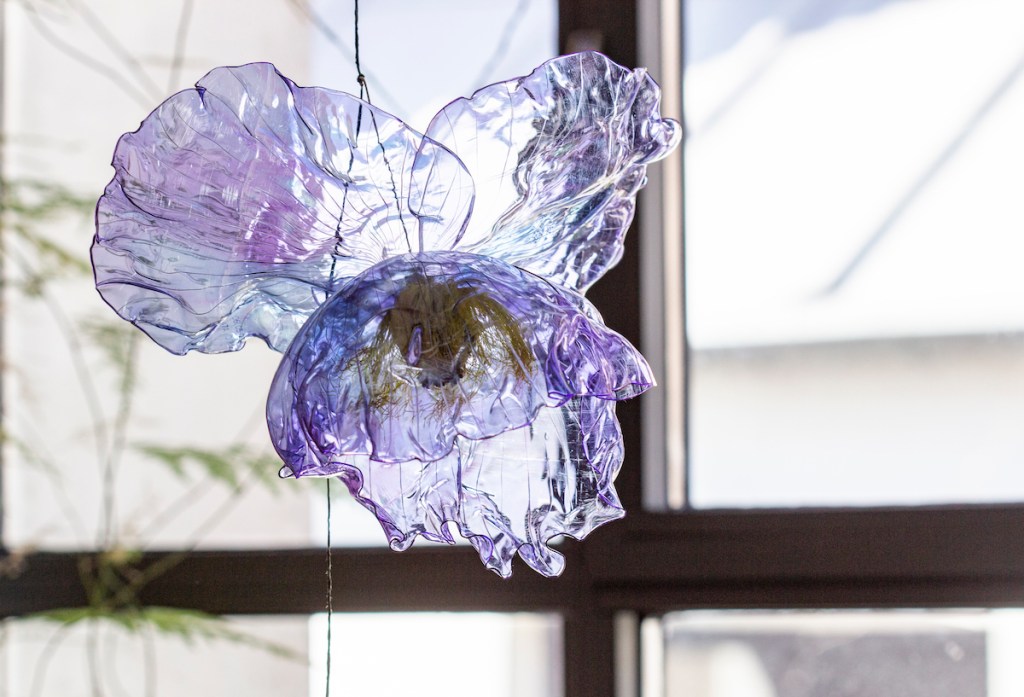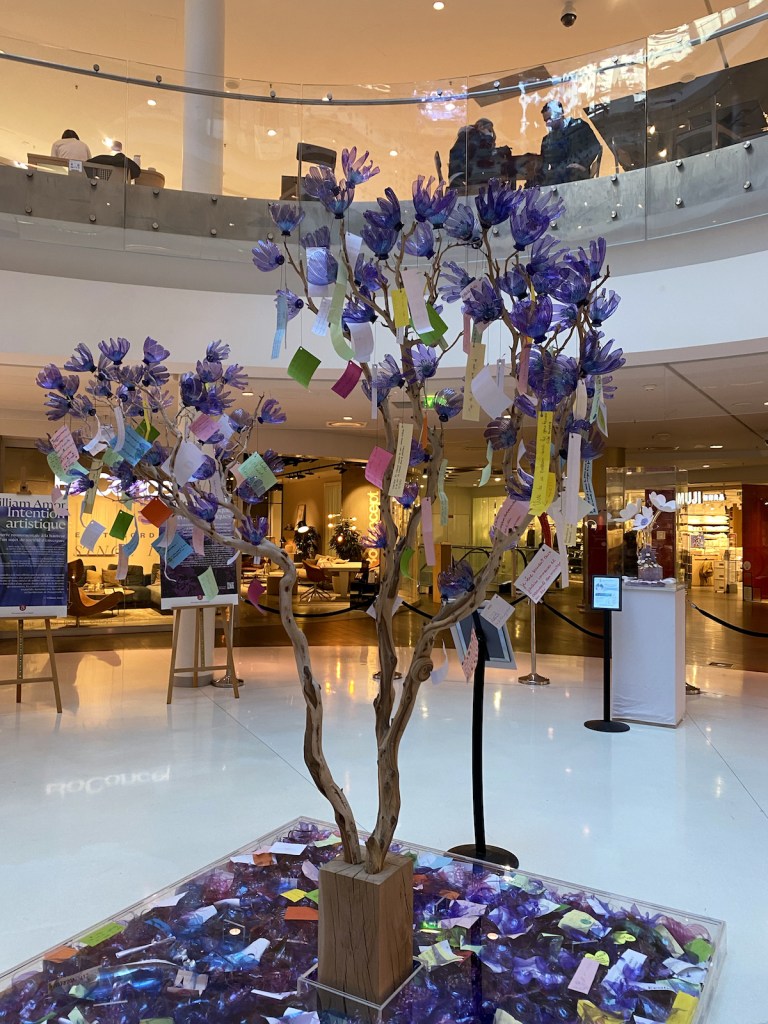 Paris, France — It is a beautiful shopping center nestled on the banks of the Seine and it is even more beautiful with two monumental works by the contemporary artist William Amor which seemingly float inside. Beaugrenelle Paris shopping center is showcasing the work called Bottles in the Sea a Poetic Garden, a work made from up cycled plastic bottles — the artist’s specialty. Between January and February of this year some 10,000 plastic bottles were collected by the clients, neighbors, boutiques and partners of Beaugrenelle Paris which the artist has transformed into two eye-catching works. The major monumental work which hangs from the top of the atrium is 13 meters high and seven meters in diameter and is a feast for the eyes, hundreds of flower-covered vines. Beneath this work is his Message Tree upon which messages from the general public and school children have been placed and which will be auctioned off on June 23rd with the proceeds going to the Bonnes Fées (The Good Fairies) charity run by the former Miss France beauty pageant winners to help women with breast cancer. Beaugrenelle invited people to contribute a positive message about the planet to slip inside the up cycled bottles. The monumental works are complemented by an educational and interactive exhibition on the theme of plastic and how it is recycled. The exhibition invites the public to see the impact of human beings on the environment but also imparts a message of hope for cleaning up this same environment.