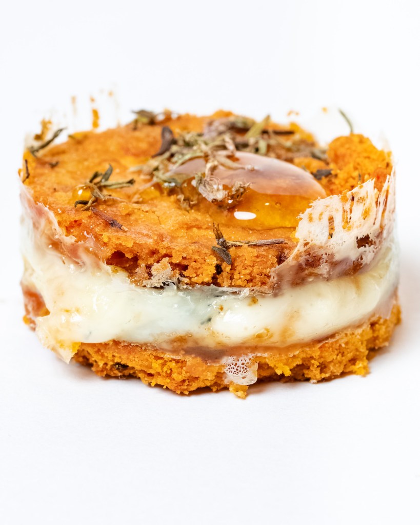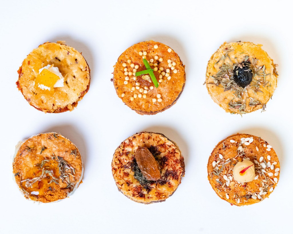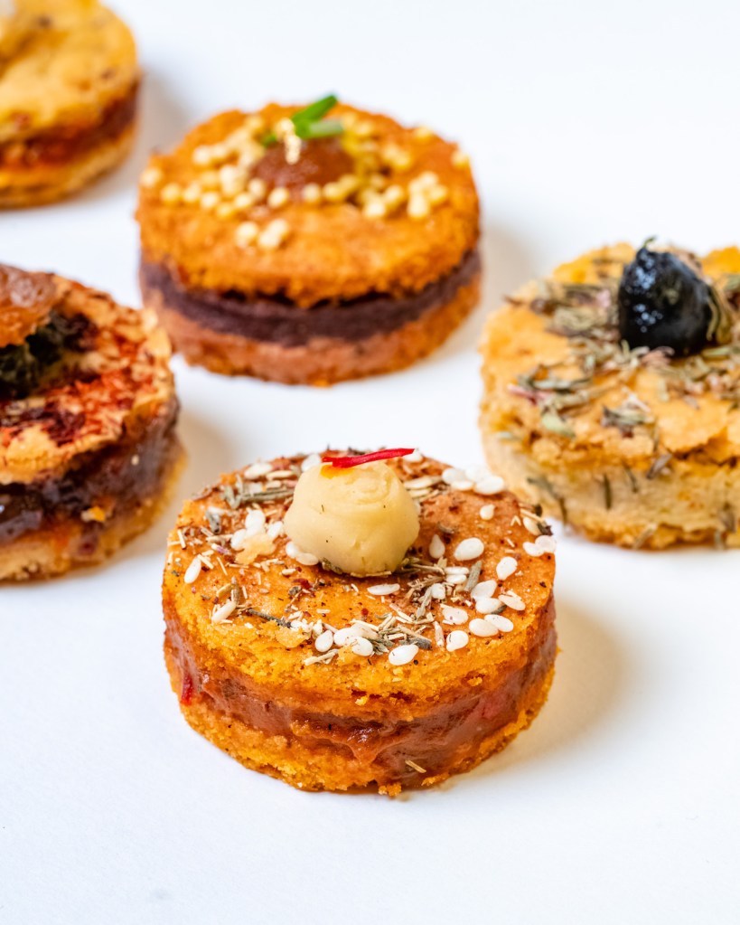 Paris, France — Château Sablé, a gourmet venue specialized in making sweet buttery cookies known as sablés in French has just embarked on something new, savory cookies perfect for a cocktail moment or any moment. The pastry chef Thibault de Chastenet who spent the first half of his career as an artist and now creates myriad cookies, made with exceptional, sourced and seasonal ingredients has turned his talent to savory versions of his unparalleled cookies. Garnished cookies include a tomato based cookie topped off with eggplant spread and garnished with white bean cream, zaatar and safran or alternatively with black Greek olive spread topped off with a dollop of lemon marmalade, made with lemons from the Amalfi coast, chives and millet. Another version is topped off with goat cheese, thyme honey and thyme.