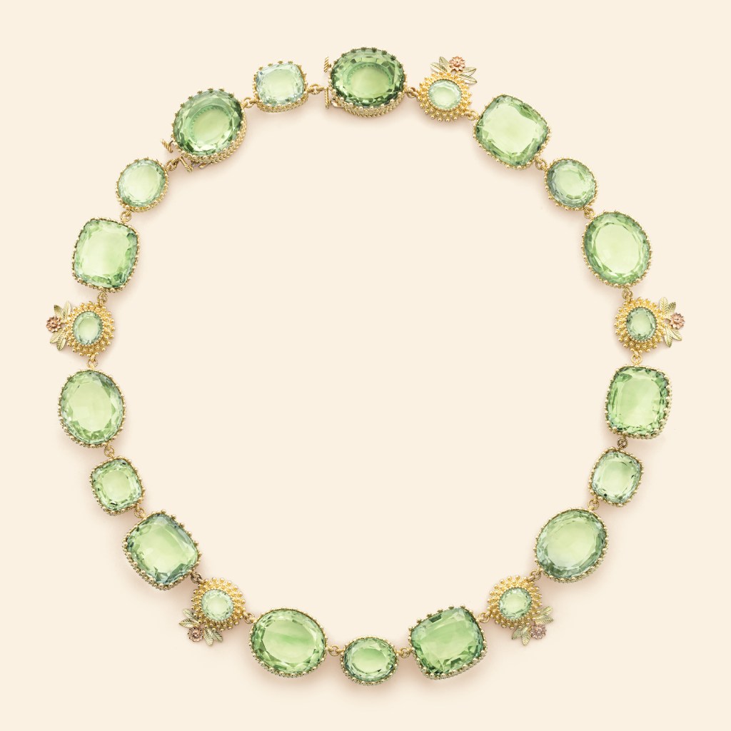 Today the house’s artistic director Laure-Isabelle Mellerio brings this timeless style to the house’s latest collection. The colors astound with the powerful serenity of the violet amethysts and their nuances of pink, the myriad greens of the prasiolite, which is a rare green variety of quartz, the seemingly sun-drenched orange of the citrines and the needlelike inclusions and degrees of whiteness of rutilated quartz. Pink, green and yellow gold all join together in the pieces in three different patterns.