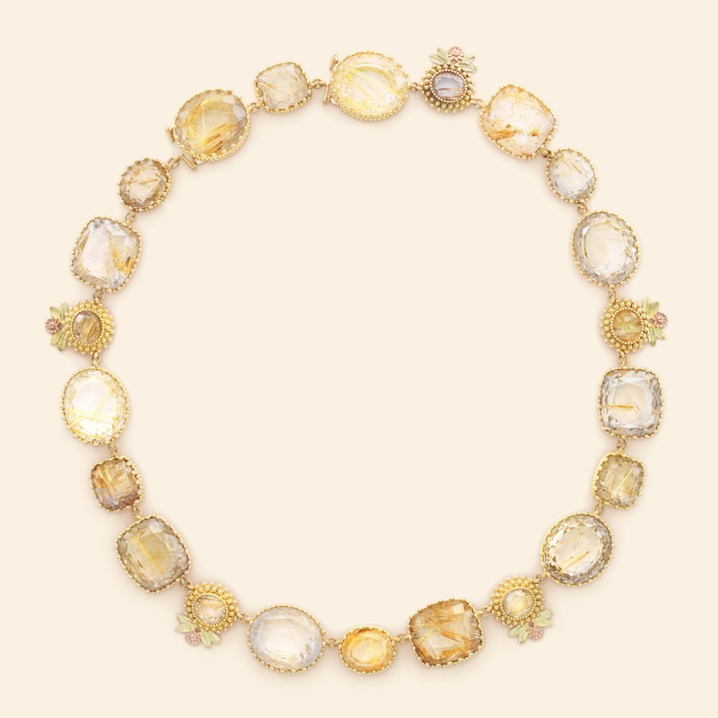 The necklaces — which are transformable — and resemble 19th century adornments are studded with lace-like gold flowers underscoring Mellerio’s close relationship with nature.