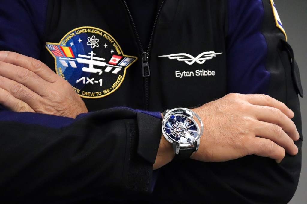 It’s blue and it’s beautiful and it has left the Earth’s atmosphere and returned safely. So safely that the Jacob & Co. Astronomia Tourbillon Bucherer Blue timepiece outfitted with a triple axis tourbillon is slated to be auctioned by Sotheby’s in New York on July 26th. The watch was carried on board the Axiom Space AX-1 mission to the International Space Station last April 8th by philanthropist and mission specialist Eytan Stibbe. The four-member crew and the watch returned safely off the Florida coast on April 25th.