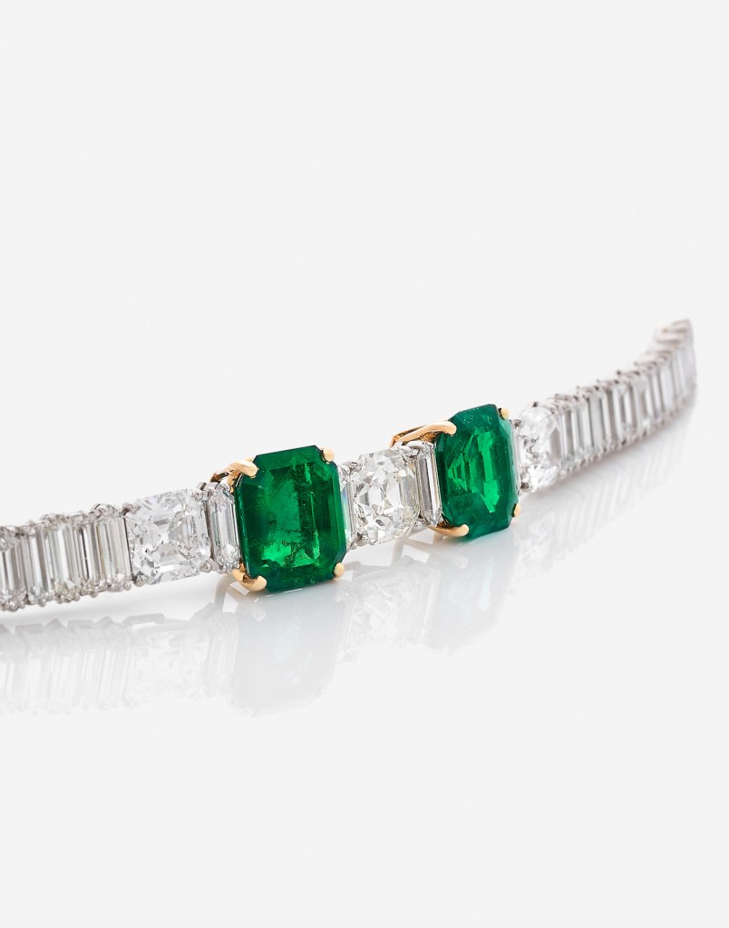 A bracelet in platinum, gold and emeralds from the house of Guillemin & Soulaine was sold to a European collector for US$ 322,523. Photo courtesy Artcurial. Handout via The Gourmet Gazette